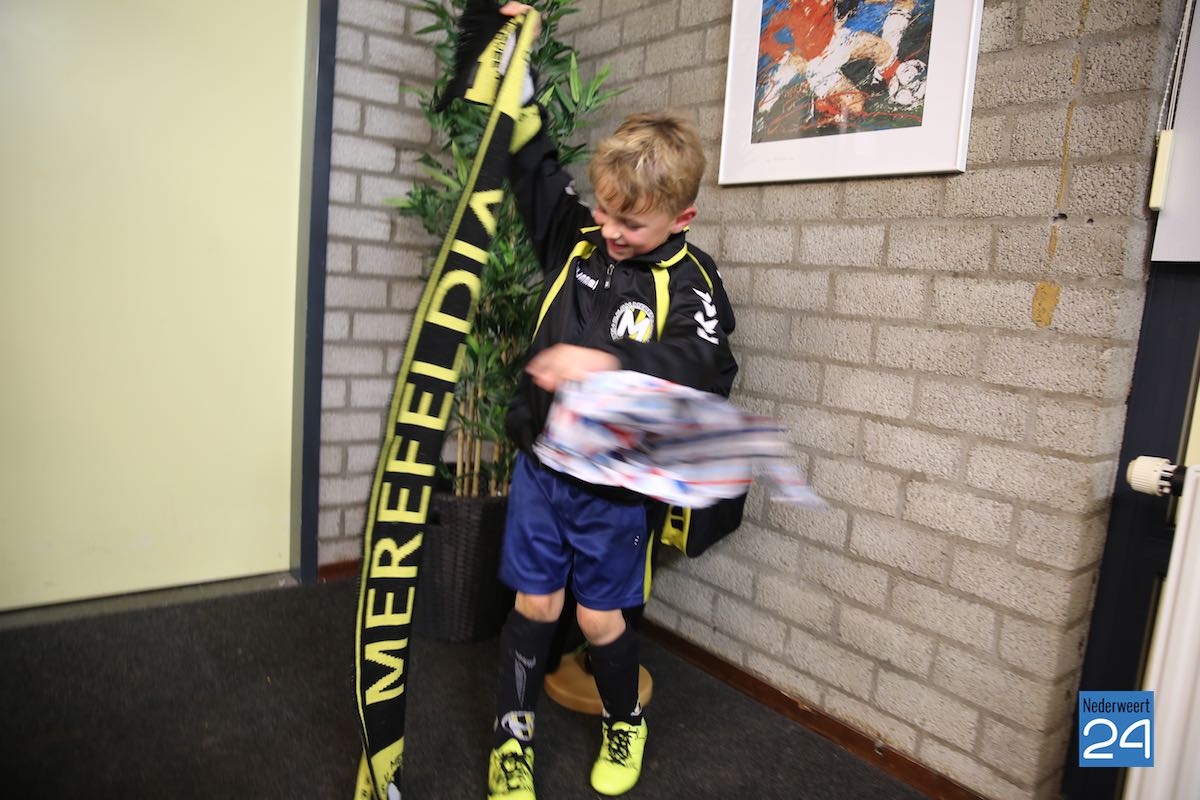 Omdat Merefeldia toch even stil wilt staan bij dit unieke moment, ontving het kersverse lid uit handen van secretaris Joep Gommans een attentie: een Merefeldia-sjaal. De zesjarige Geert speelt en traint vanaf deze week bij de F-mini’s.