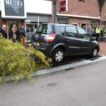 Inge Coolen van MEORA Trendstore zag het ongeval vanachter het raam gebeuren en schreef op Facebook “Bij gebrek aan parkeergelegenheid wij gaan stapelen“.