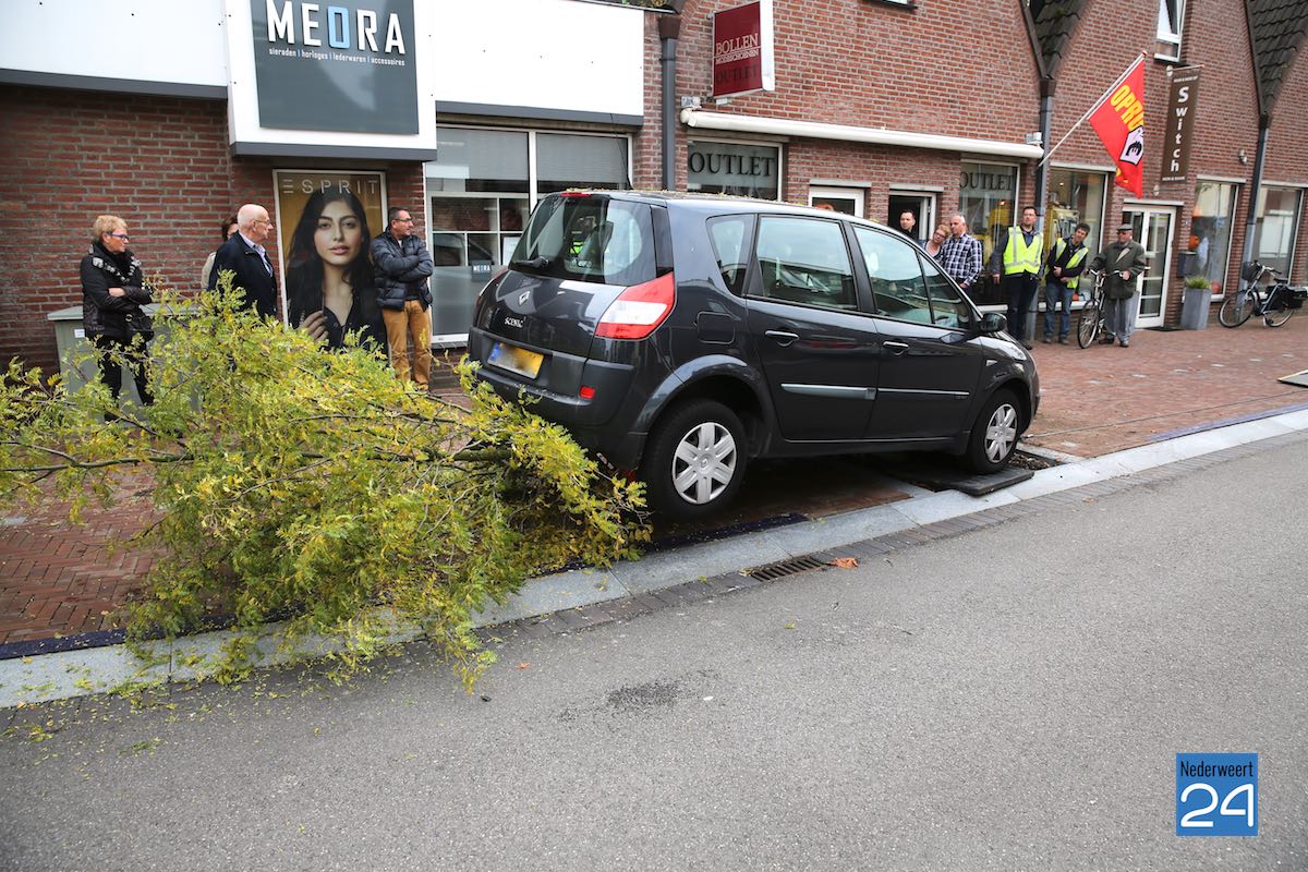 Inge Coolen van MEORA Trendstore zag het ongeval vanachter het raam gebeuren en schreef op Facebook “Bij gebrek aan parkeergelegenheid wij gaan stapelen“.