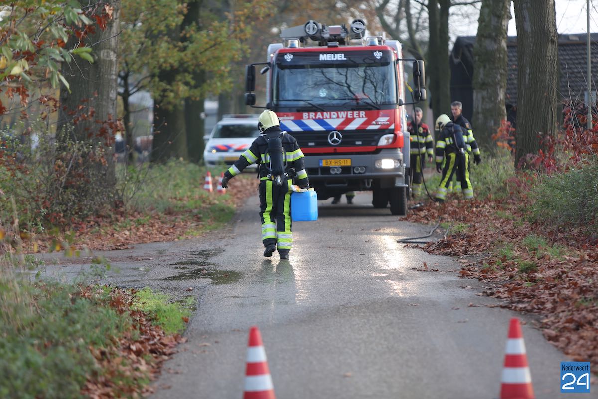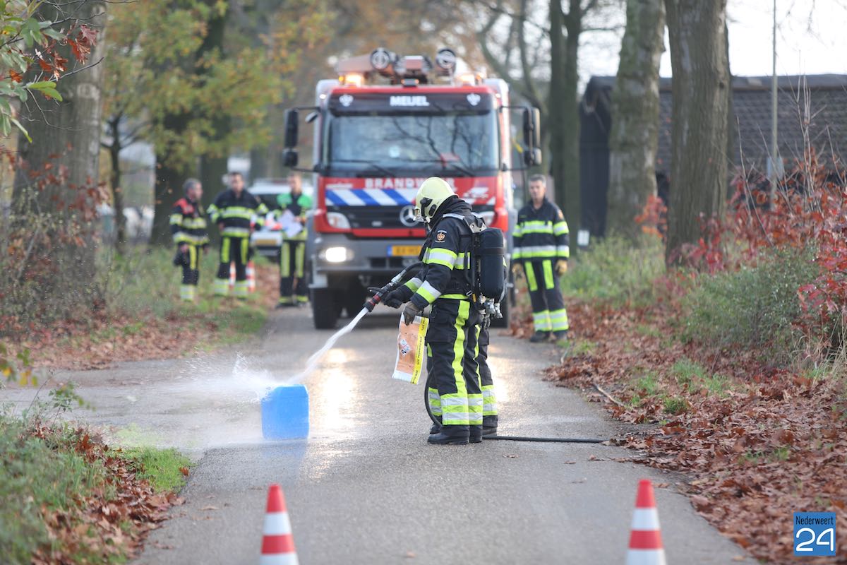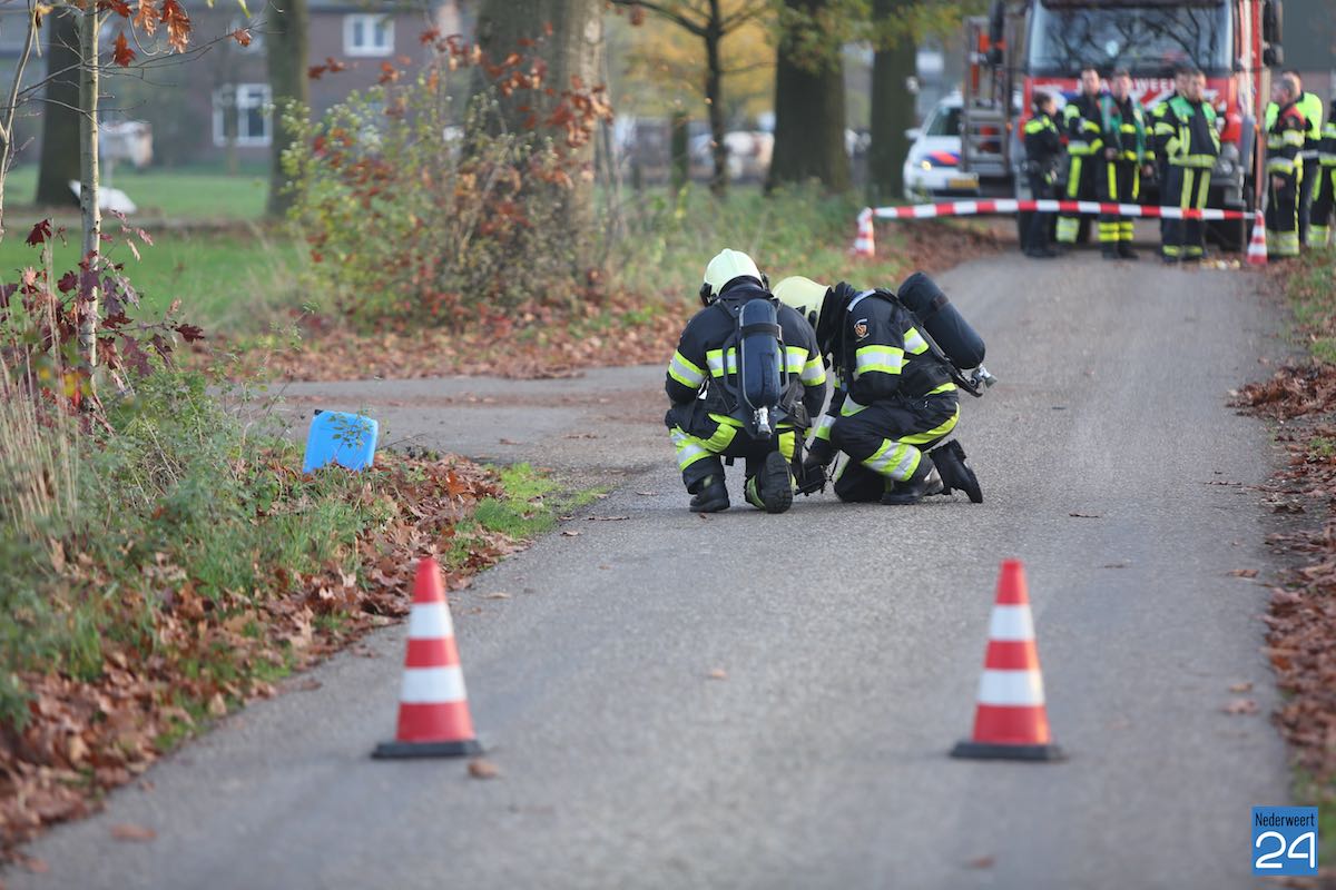 UPDATE: De brandweer heeft onderzoek gedaan. Het blijkt te gaan om een vat formaline, ontsmettingsmiddel wat veel gebruikt wordt op boeren bedrijven. Het gaat om een vat van een boer uit de buurt. De brandweer heeft de plek gereinigd en het vat is terug naar de eigenaar.
