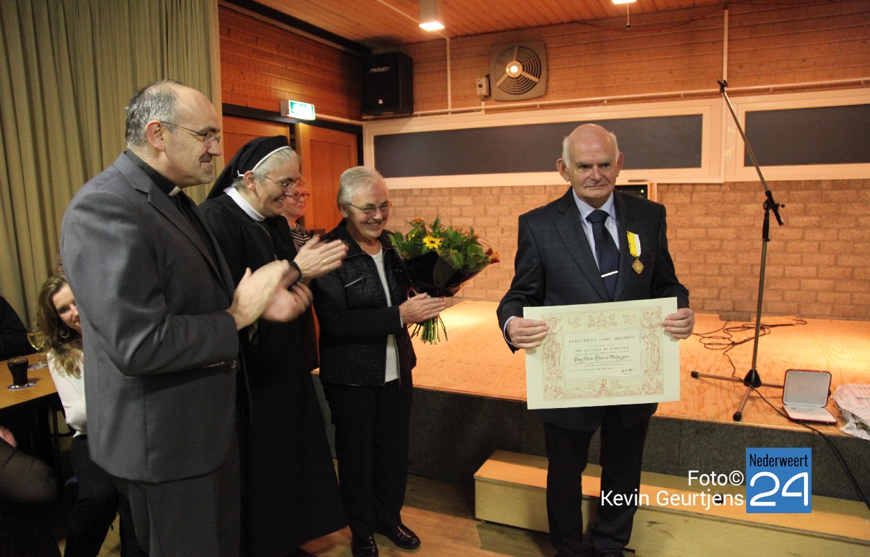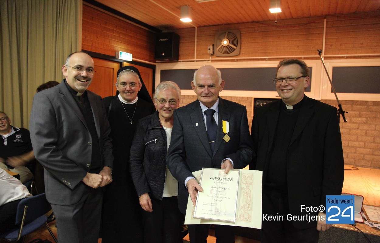 Bert Verheggen ontvangt de onderscheiding omdat hij zich gedurende 25 jaar op bijzondere wijze heeft ingezet voor de Kerk en samenleving. Zijn grote betrokkenheid bij het kerkelijk gebeuren, als koster, collectant en accoliet, zijn grote verdiensten van hem. De vele uren, die Bert in dit werk gestoken heeft, had hij nooit kunnen doen zonder de grote steun van zijn vrouw Mien. Uiteraard deelt zij in de onderscheiding en in de loftuitingen aan haar man en ontving daarbij een mooie bos bloemen. Tijdens de uitreiking waren ook zijn zoon, Pastoor Ruud Verheggen en zijn dochter Zuster Bernarda (Anita) Verheggen aanwezig.