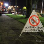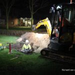 De werkzaamheden zijn vanavond direct gestart. Rond de klok van half 8 waren drie busjes, een minigraver en drie man sterk aan het werk om het lek te dichten.