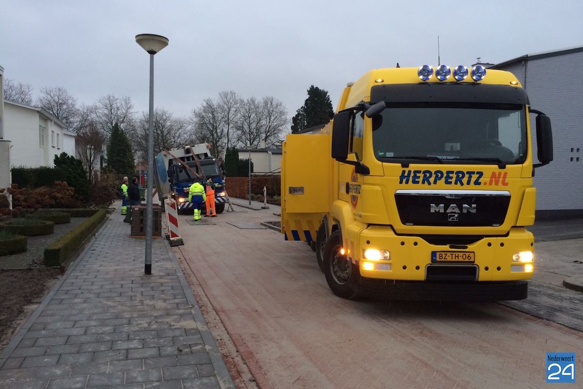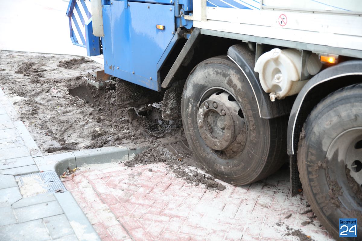In de straat zijn wegwerkzaamheden en worden nieuwe wegversmallingen aangelegd. Deze liggen er al, maar er zijn nog geen planten in gezet. De chauffeur heeft gedacht dat rechtdoor makkelijker was maar kwam toen vast te zitten in de blubber. Een takelwagen van Herpertz heeft hem uit de modder getrokken.