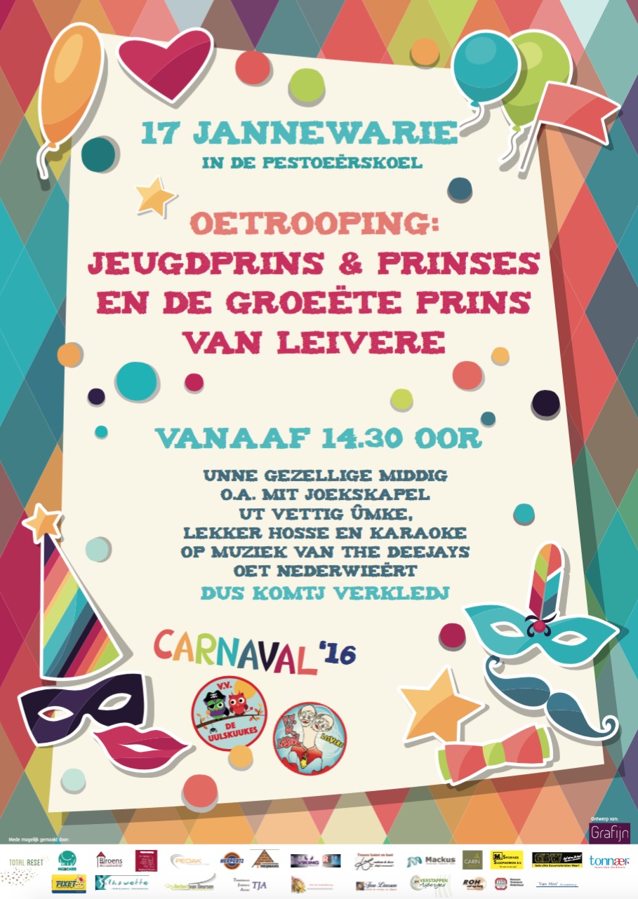 Vanaf 14.30 uur start het feestgedruis in de Pestoerërskoel en wordt bekendgemaakt wie jeugdprins en prinses van VV de Uulskuukes wordt en wie voorop zal gaan bij VV de Losböl. Verder is er een optreden van Joekskapel ‘Ut Vettig Ûmke’, kun je die middag lekker hossen en is er karaoke op muziek van de Deejays uit Nederweert. Kledingvoorschrift: ‘Kan neet gek genógt.’