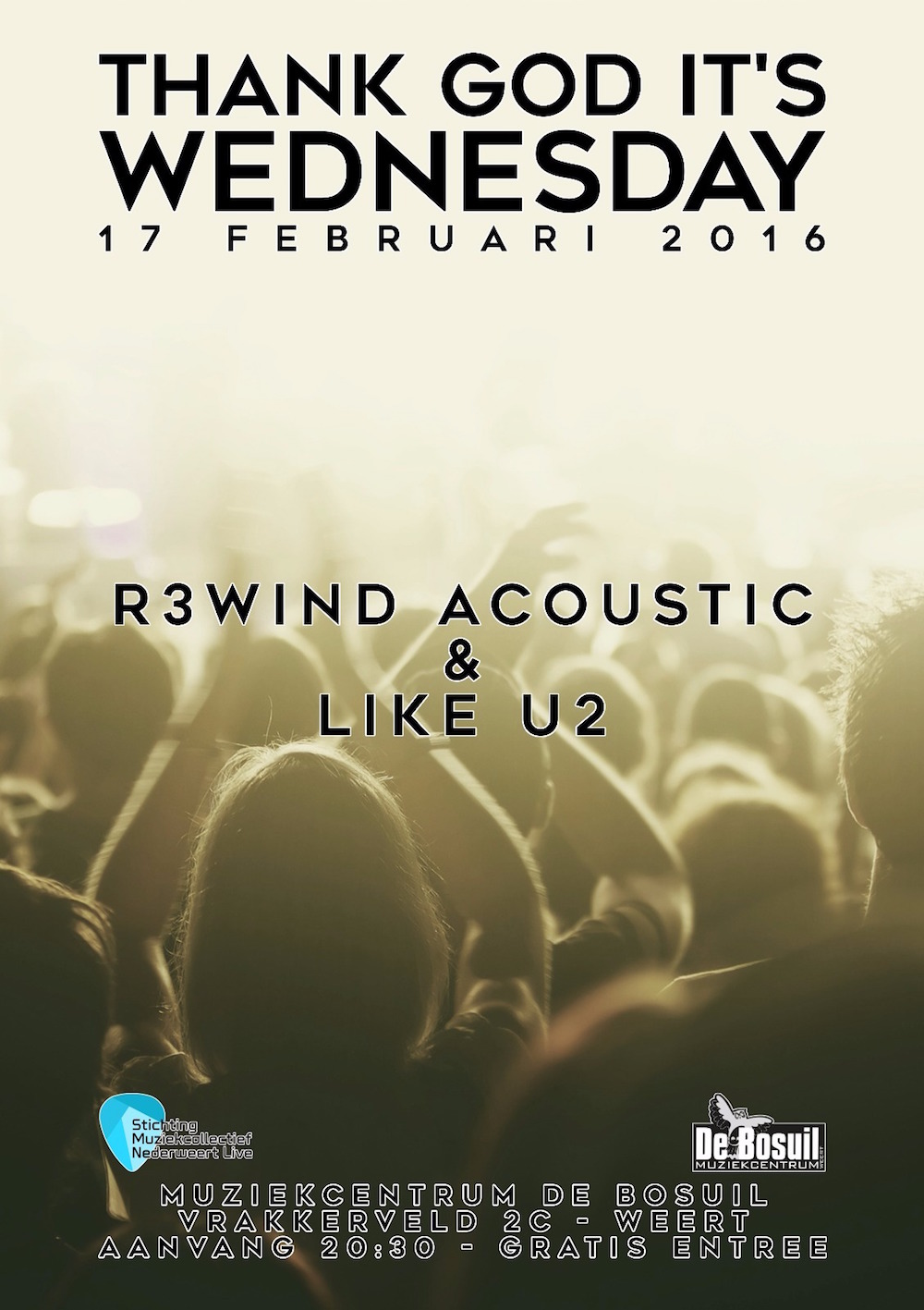 Tijdens de vorige editie van Thank God it’s Wednesday stonden er vier singer-songwriters op het podium die solo hun talent ten gehore brachten. Tijdens de eerste editie van 2016 wordt weer overgestapt op bands: R3wind Acoustic en LikeU2.
