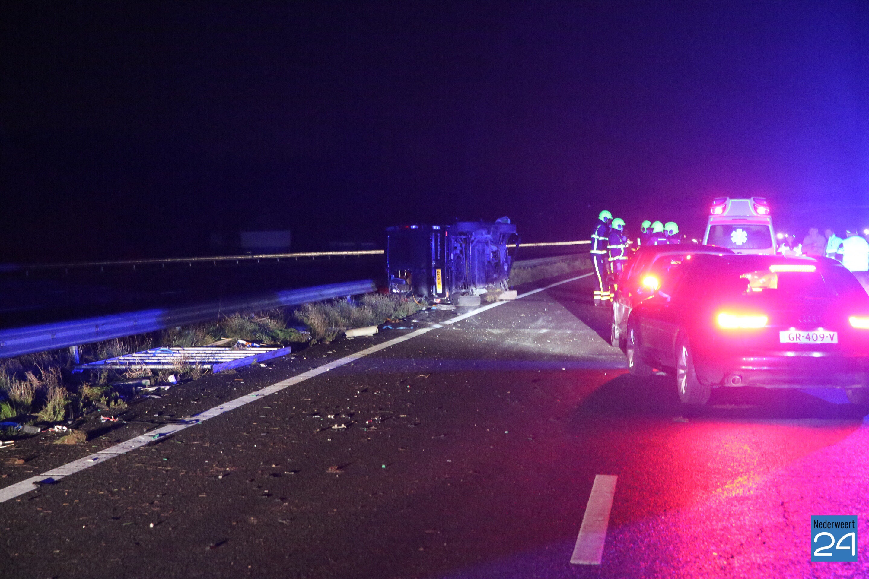 Zaterdagavond is op de afrit van de A2 bij Weert Noord een bestelbus op zijn kant beland. Het voertuig heeft waarschijnlijk rechts de vangrail geraakt waarna de wagen over de kop is geslagen en op zijn zijkant terecht is gekomen in de middenberm.