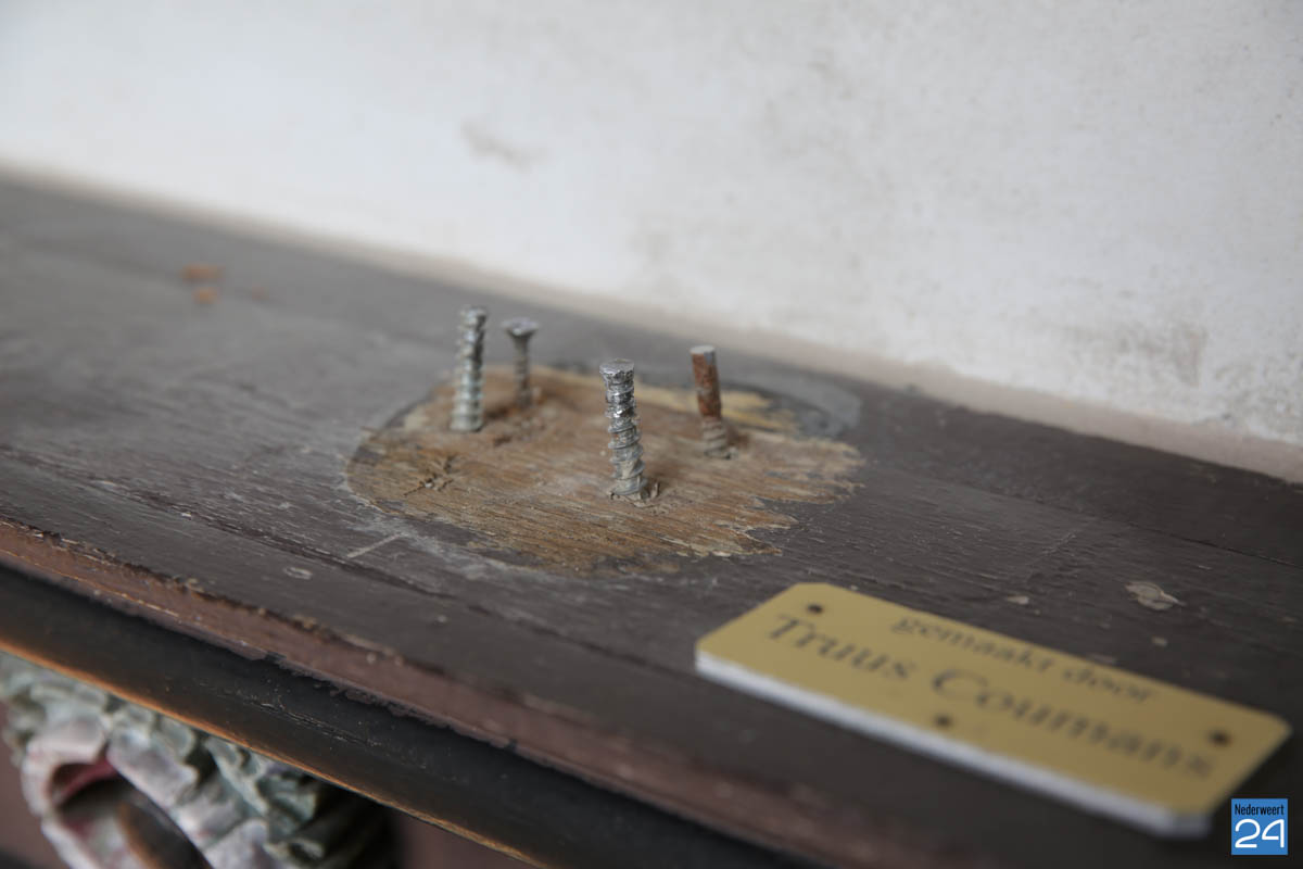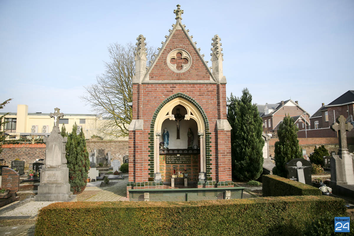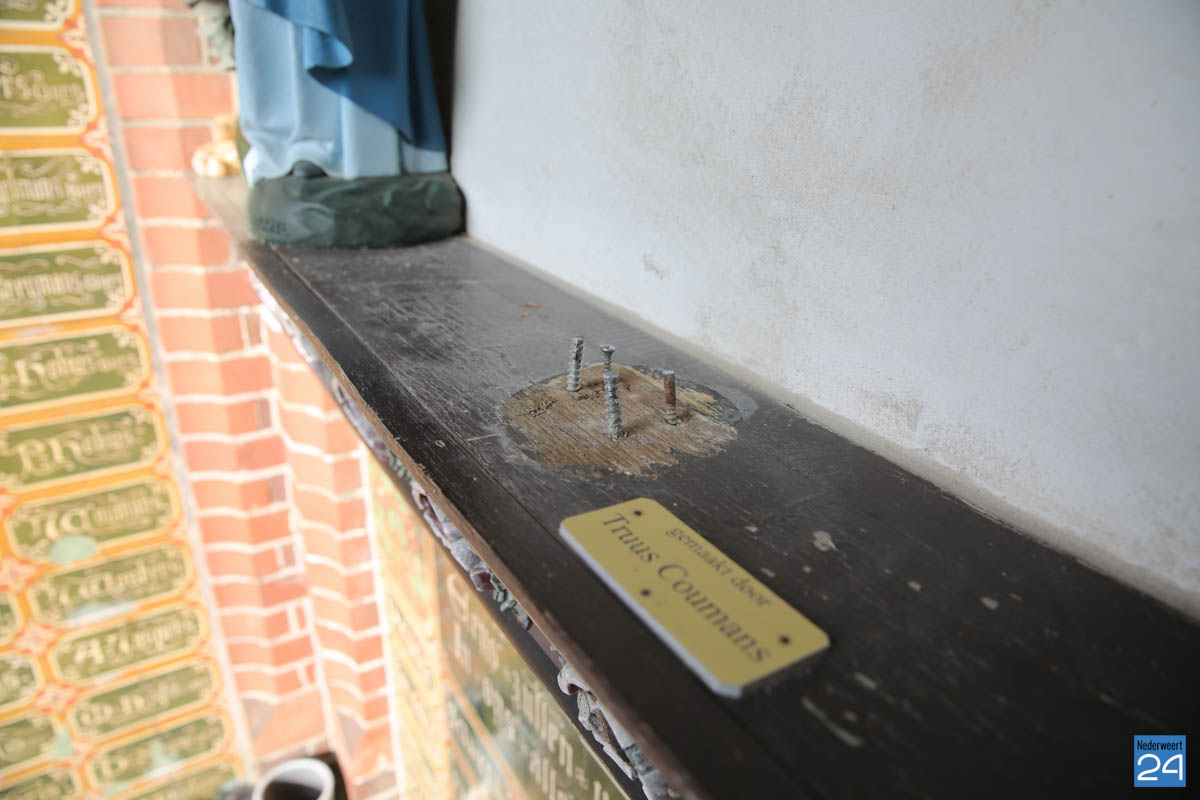 Beeldje kapel Lambertuskerk vernield-3Het beeldje met de opgeheven armen in de kapel op de begraafplaats bij de St. Lambertuskerk in Nederweert is beschadigd. Het beeldje, gemaakt door kunstenares Truus Coumans, is van de sokkel gerukt.