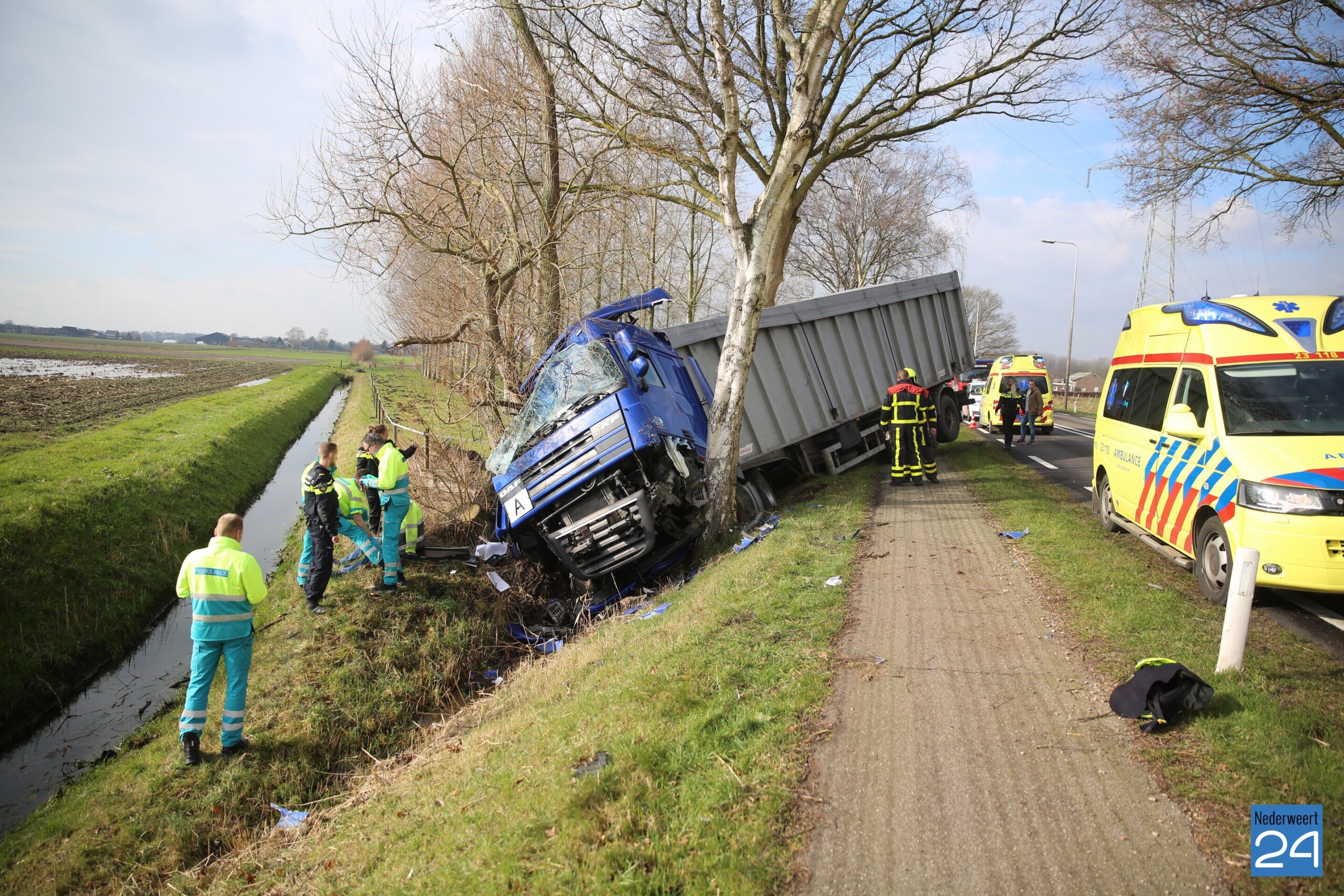 Donderdagochtend is op de Roermondseweg (N280) ter hoogte van Kelpen-Oler een vrachtwagen langs de weg geraakt en tussen twee bomen in een greppel tot stilstand gekomen. De chauffeur is met hulp van het brandweerpersoneel uit de vrachtwagencabine kunnen klimmen en voor onderzoek meegenomen naar het ziekenhuis.