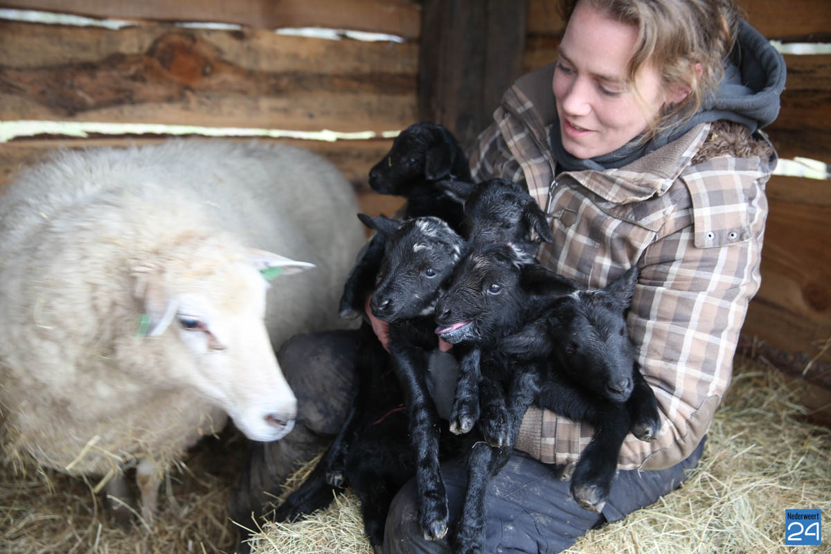 “Vaak denken mensen dat de eerste lammetjes zo vroeg geboren worden omdat het vroeg voorjaar is. Niets is minder waar. De draagtijd van een schaap is vijf maanden minus vijf dagen en alles hangt dus af van het moment dat wij de ram zijn gang laten gaan, de daad dus…,“ aldus Marieke. Vijf lammetjes in een worp is wel heel bijzonder, maar ondanks dat zijn ze alle vijf goed op gewicht en maken ze het goed. De eerste 24 uur zijn het meest kritiek.