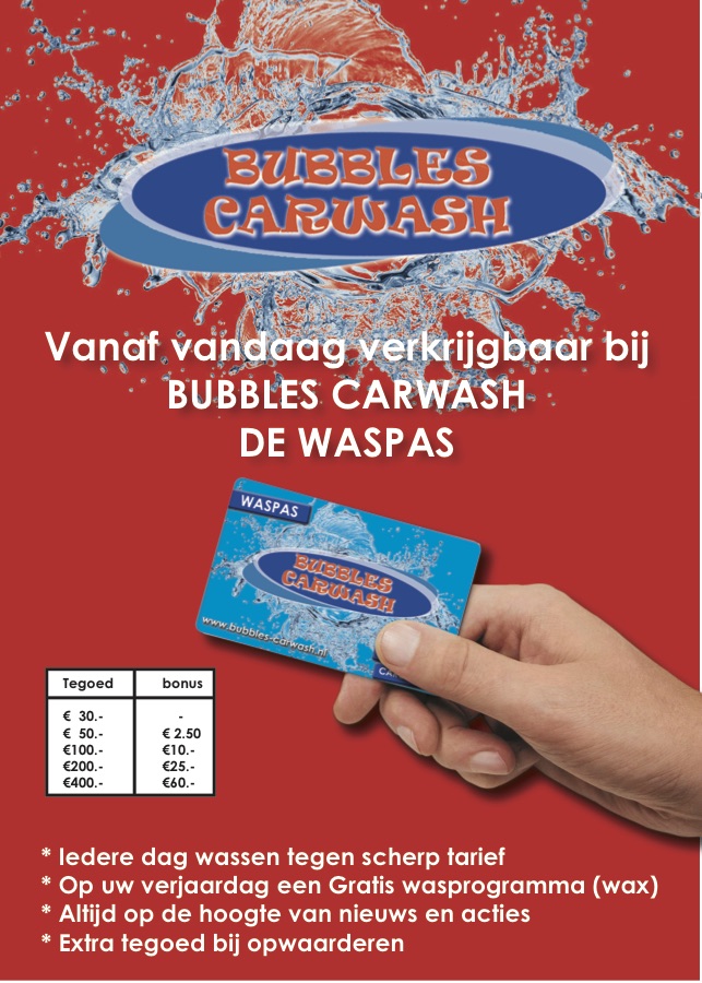 Als blijk van waardering voor hun trouwe klanten kun je bij Bubbles Carwash nu een Waspas aanschaffen. Hiermee kun je 6 dagen per week tegen een scherp tarief je auto laten wassen of gebruik maken van de VIP wash.