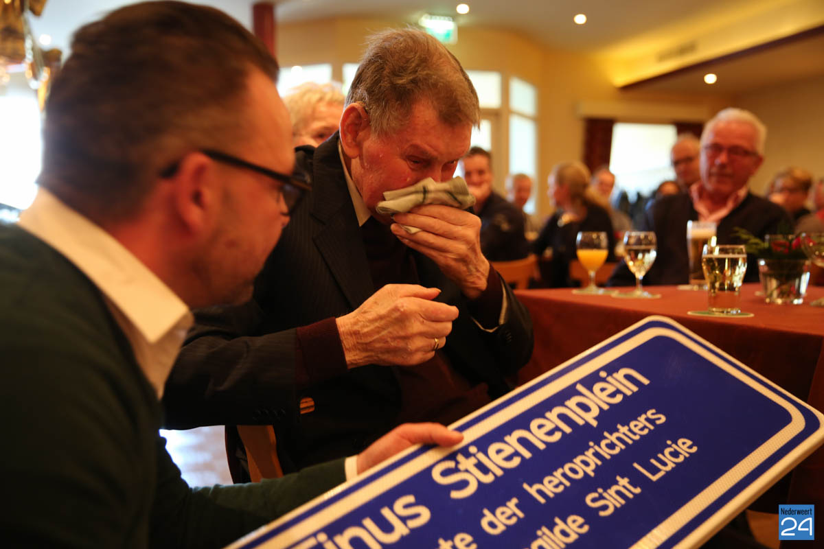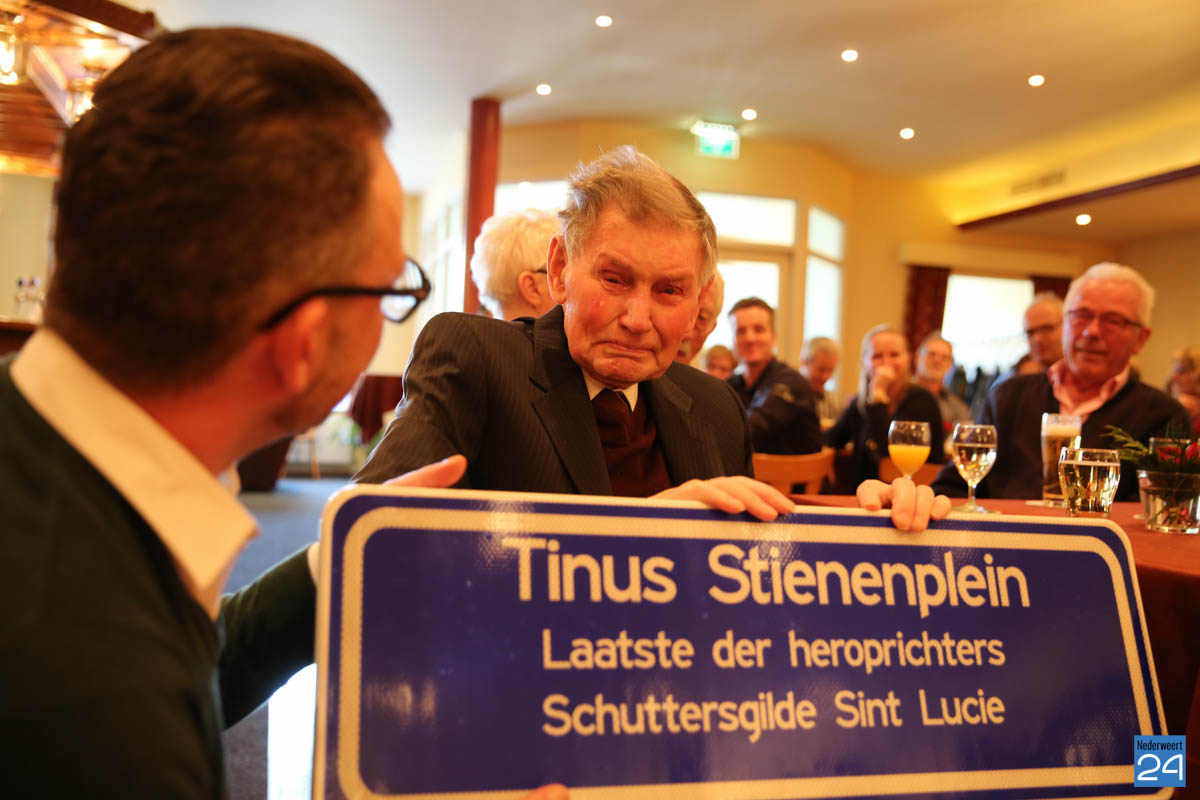 De nog vitale Tinus Stienen vierde zijn 91e verjaardag bij zaal Wetemans in Leveroy. Tinus was mede, en nog de enige in leven zijnde heroprichter van schuttersgilde St. Lucie uit Nederweert-Eind. Een reden voor het bestuur van de schutterij om Tinus een bijzonder cadeau aan te bieden. Een zeer emotionele jarige, kreeg onder een daverend applaus van de aanwezige familie een bord aangeboden door de voorzitter van de schutterij met de tekst “Tinus Stienenplein, Laatste der heroprichters Schuttersgilde St. Lucie“.