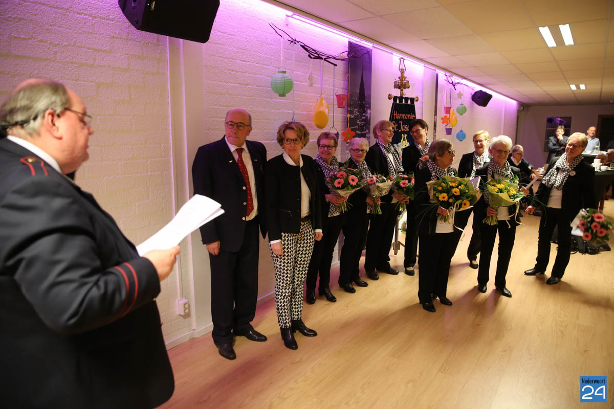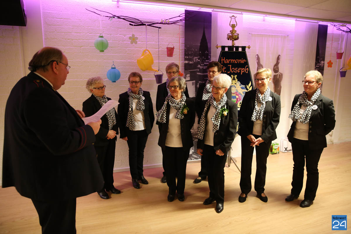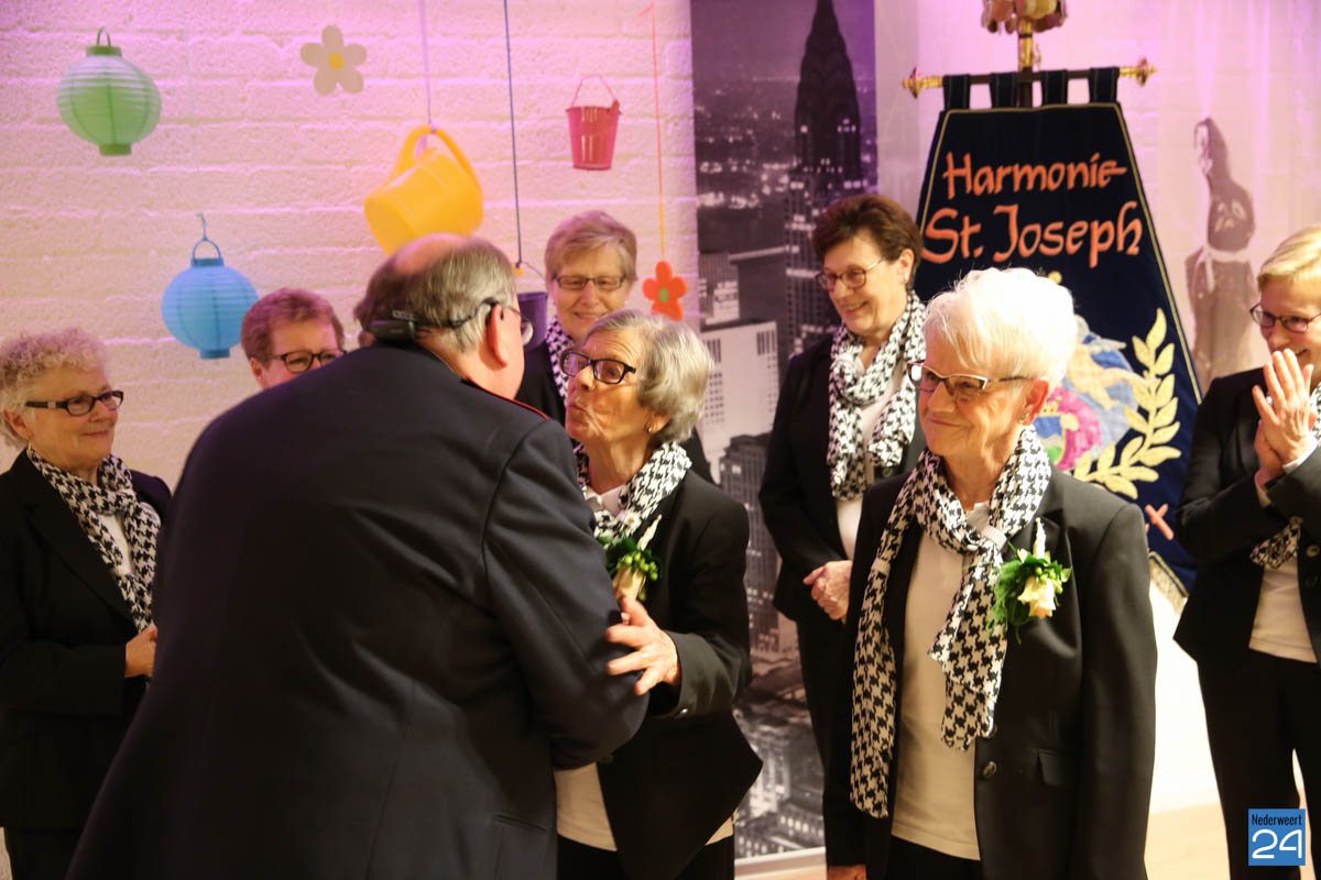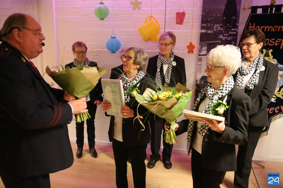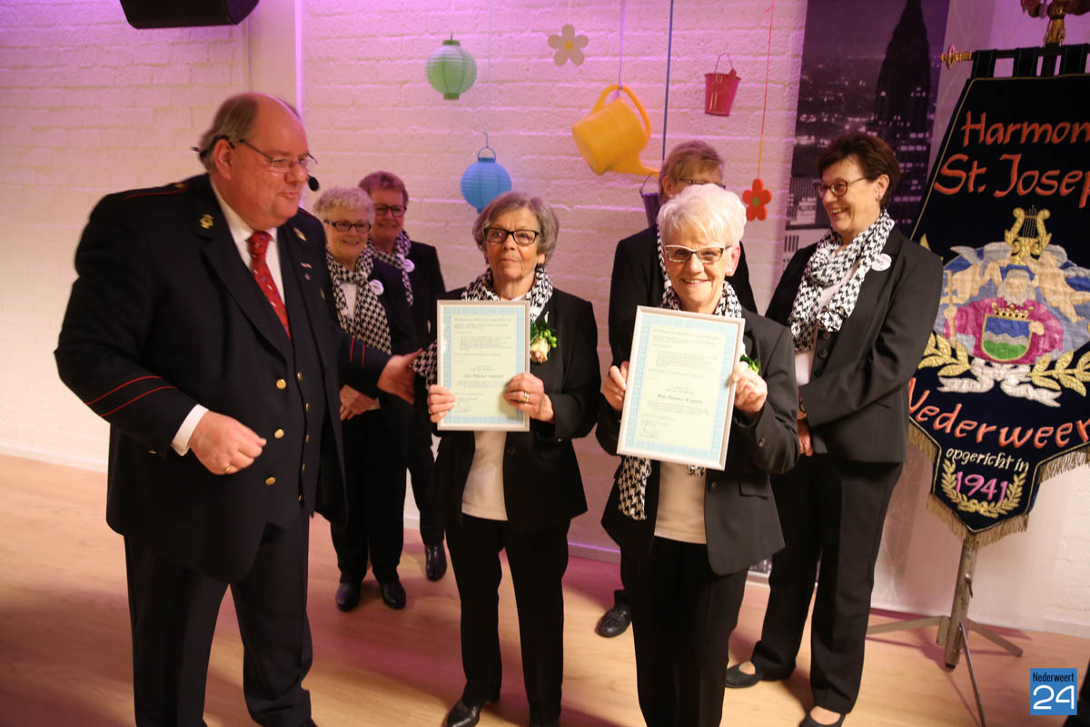 Twee leden van het Damescomité zijn vanaf het allereerste uur actief in en dat zijn Lies Pleunis-Steijvers en Mia Pleunis-Koppen. Al 25 jaar zetten zij zich in voor de harmonie. Al 25 jaar steken zij de handen uit de mouwen en dat op een zeer betrokken én positieve manier. Voorzitter Giel Bruijnaers kon daarom bekend maken dat beide dames vanwege hun bijzondere verdiensten zijn benoemd tot Lid van verdienste van Harmonie St. Joseph Nederweert.
