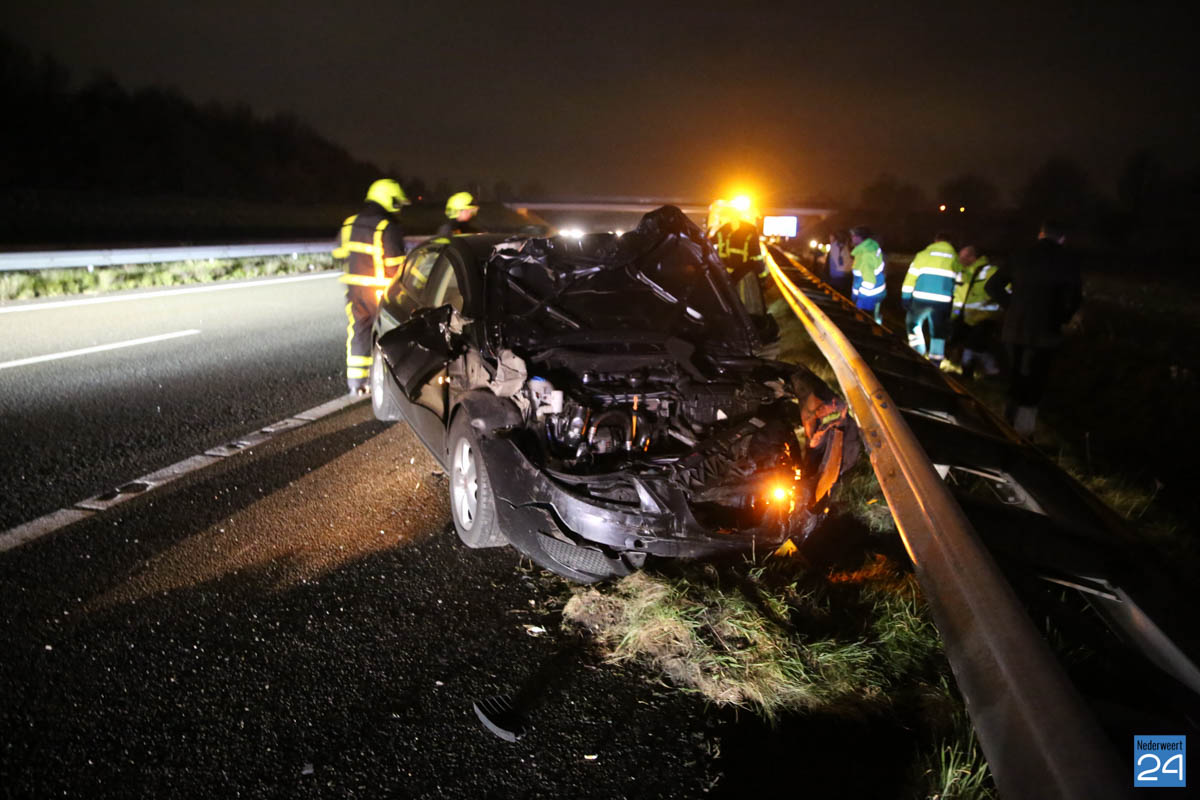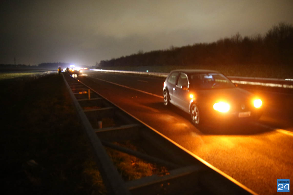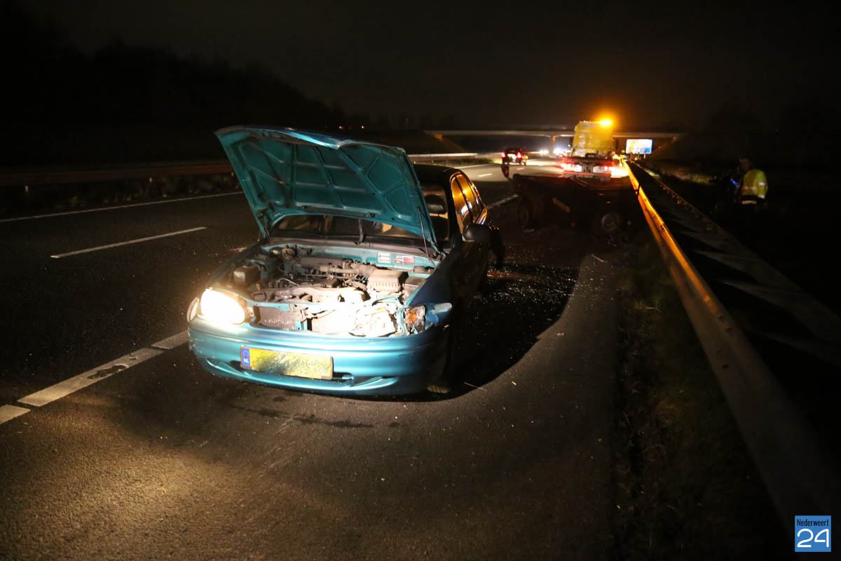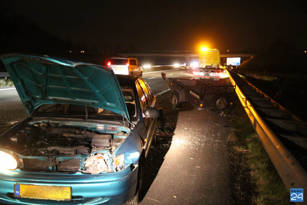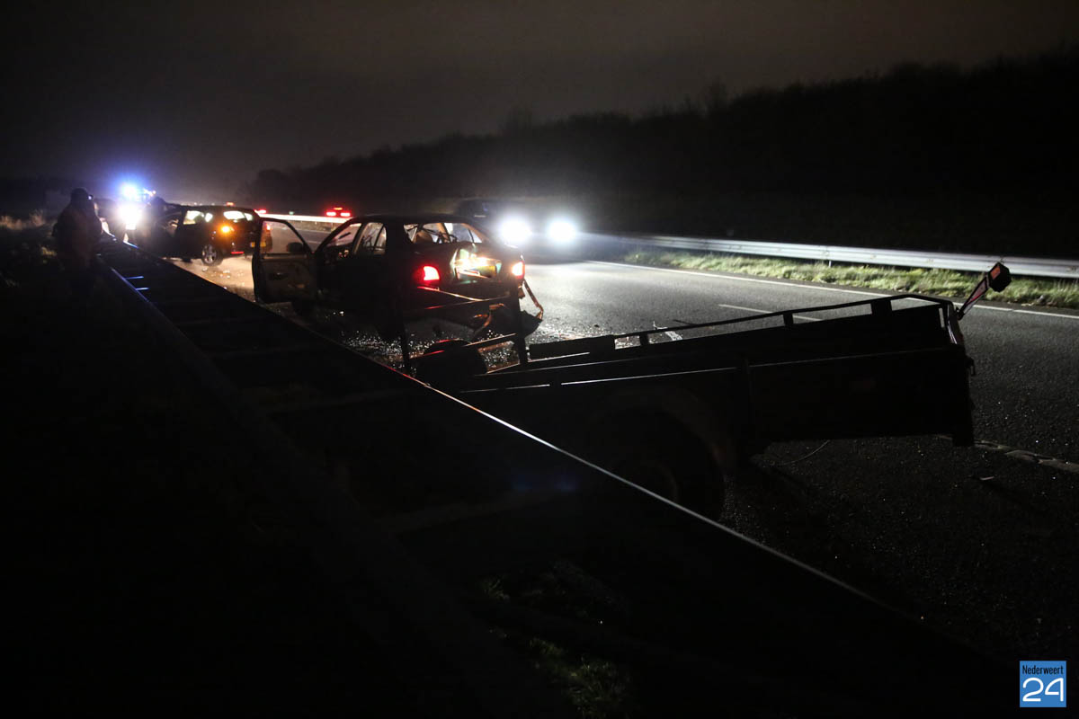 Een personenauto is waarschijnlijk zijn aanhanger verloren. Een achterop komende auto heeft deze niet kunnen ontwijken en is hier achterop gereden. Twee andere auto konden de ravage niet meer ontwijken en hebben ook schade opgelopen. Er raakte niemand gewond. Een rijstrook werd tijdelijk afgesloten door de politie.