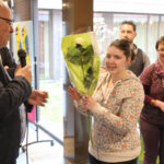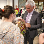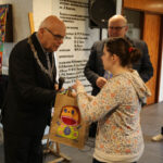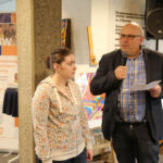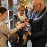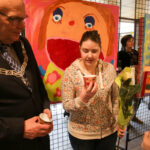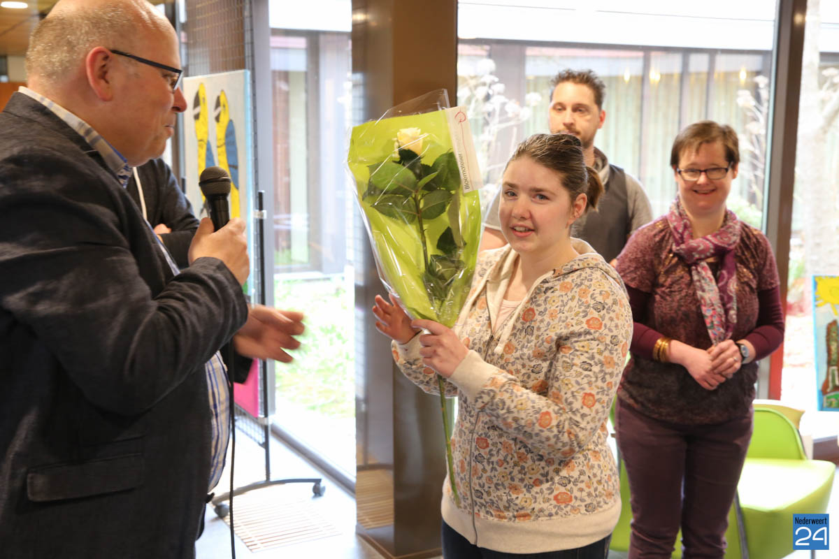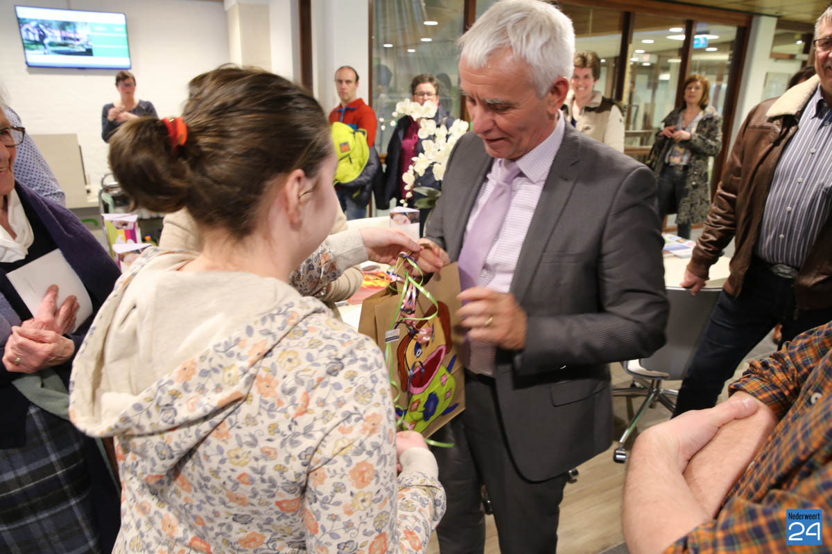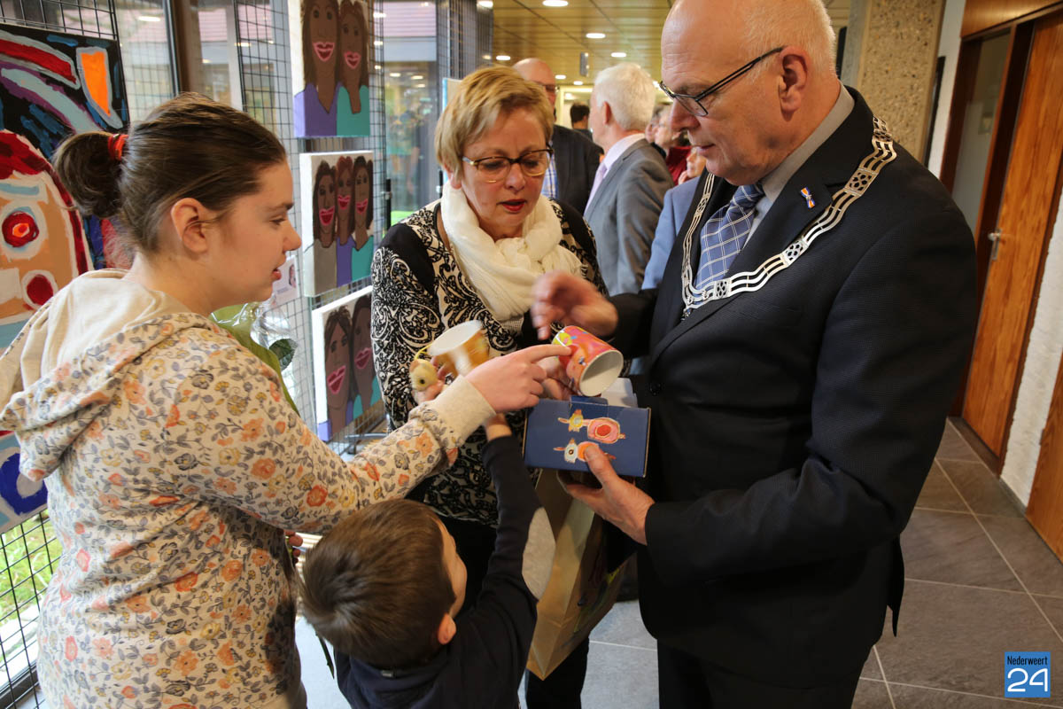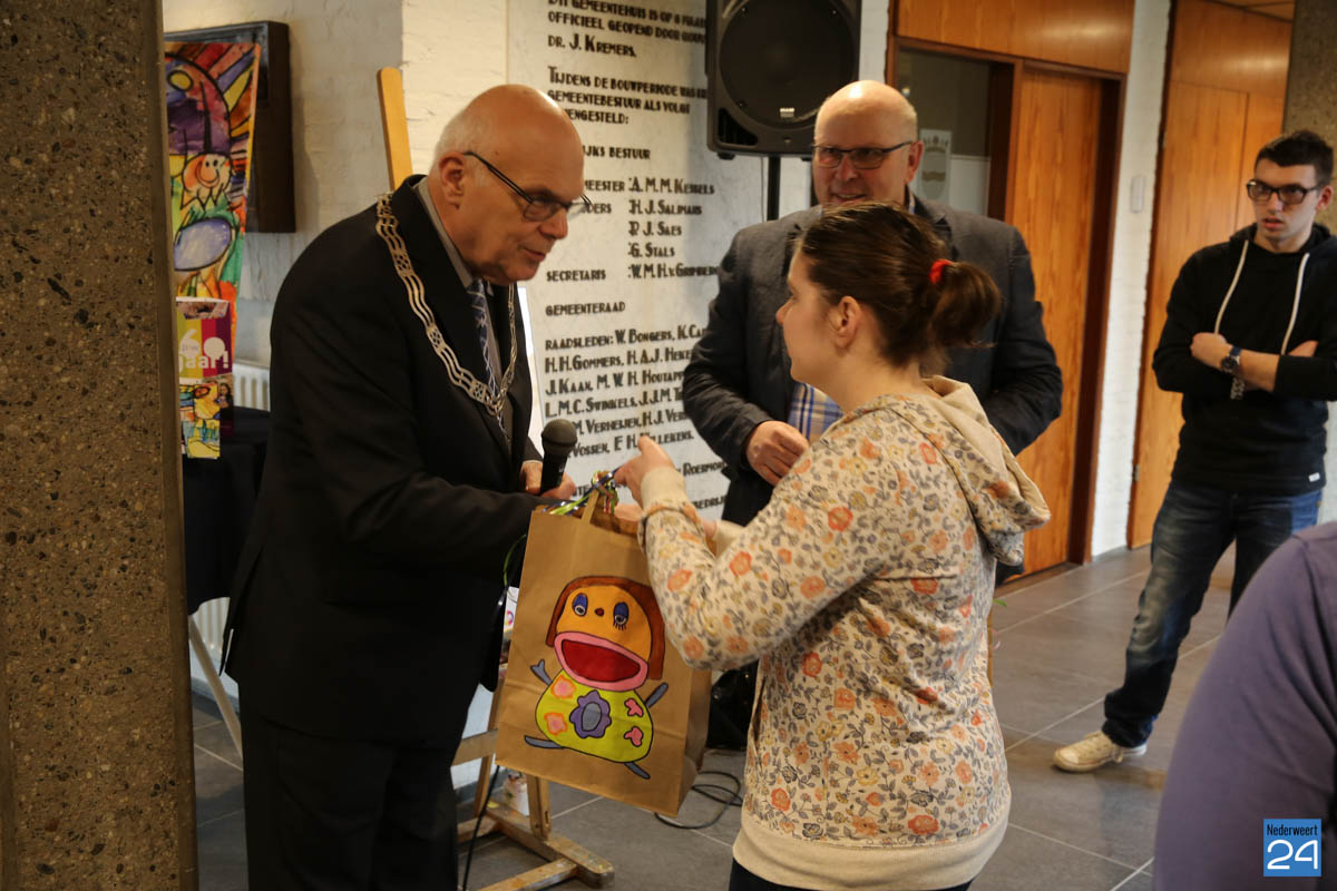 Als inwoner van Nederweert was het de eer aan Sanne om de expositie kleur te geven. Samen met de burgemeester en wethouder maakte ze een rondje langs alle kunstwerken. Als verrassing had ze voor de burgervader nog een mok met haar schilderij als opdruk.