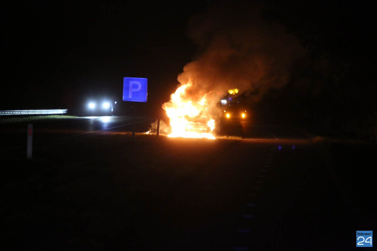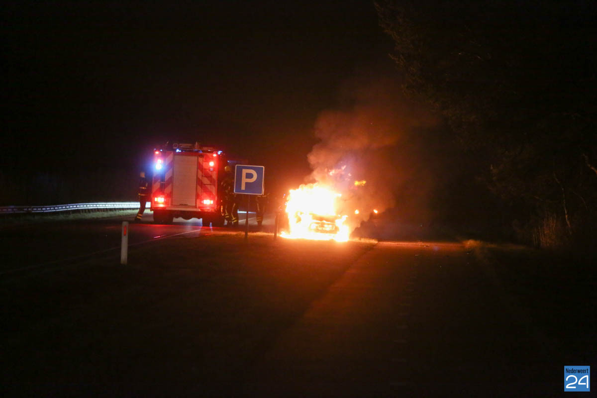 De brandweer heeft het vuur geblust. De auto kan als verloren worden beschouwd. De twee inzittenden uit Best kwamen met de schrik vrij.