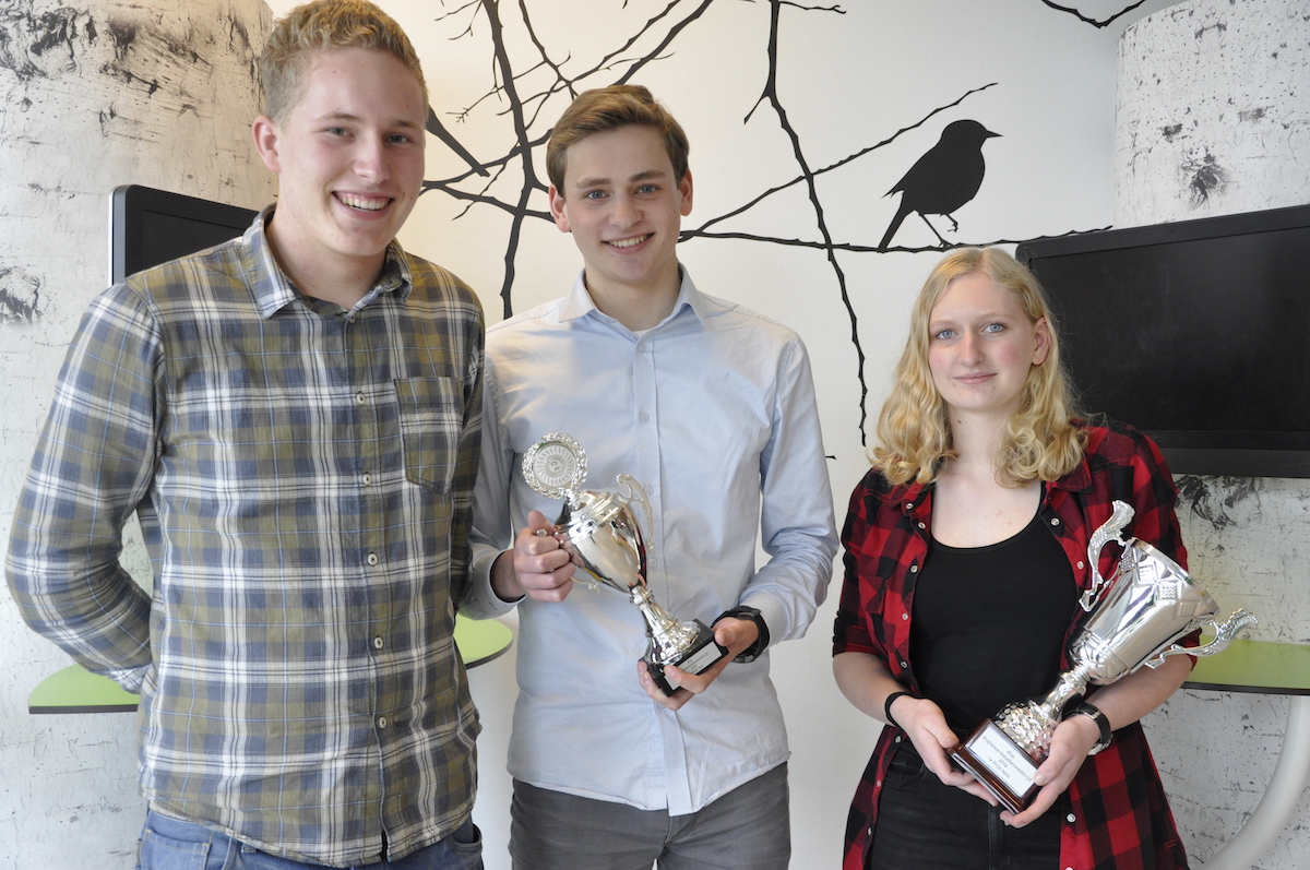 Afgelopen woensdag 6 april wist Anouk Heijnen uit HAVO-5 met haar profielwerkstuk ‘EDS’ de eerste plaats te behalen tijdens de landelijke ELOS-wedstrijd Profielwerkstukken op het Baarns Lyceum in Baarn. Emiel Schipper en Sep Bregman uit VWO-6 behaalden de tweede plaats met hun profielwerkstuk ‘Watermanagement in de Vinschgau’. Het College reisde met elf eindexamenleerlingen af naar deze landelijke wedstrijd van het Europees Platform. Begeleidend docent Jo Curfs is trots op zijn leerlingen die hier een geweldige prestatie hebben neergezet.