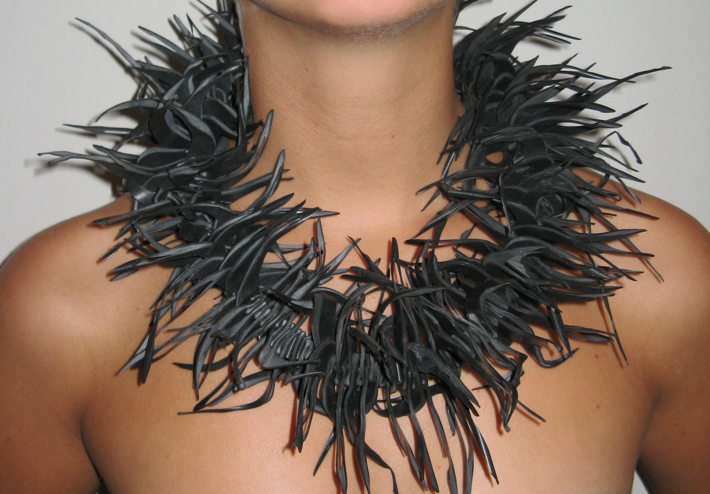 werk van Irene PfenningsVerfijnd werk met gebruikmaking van allesbehalve verfijnd materiaal, maakt Irene Pfennings uit Sittard. Haar sieraden en accessoires zijn een voorbeeld van consuminderen én van sierlijkheid.