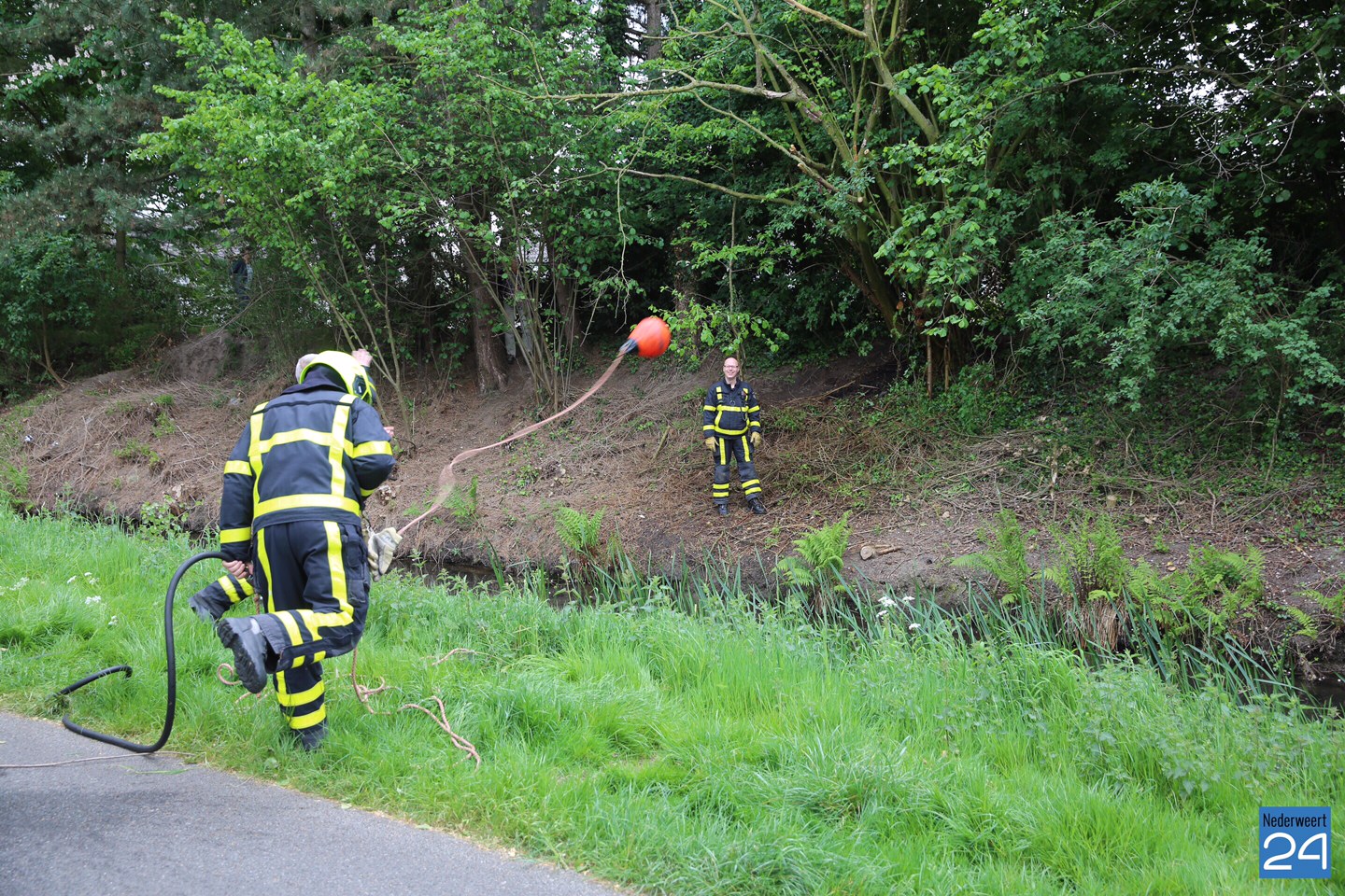 Hoe de brand is ontstaan is nog niet duidelijk. De brandweer heeft een slang over het water moeten gooien om het vuur te kunnen blussen.