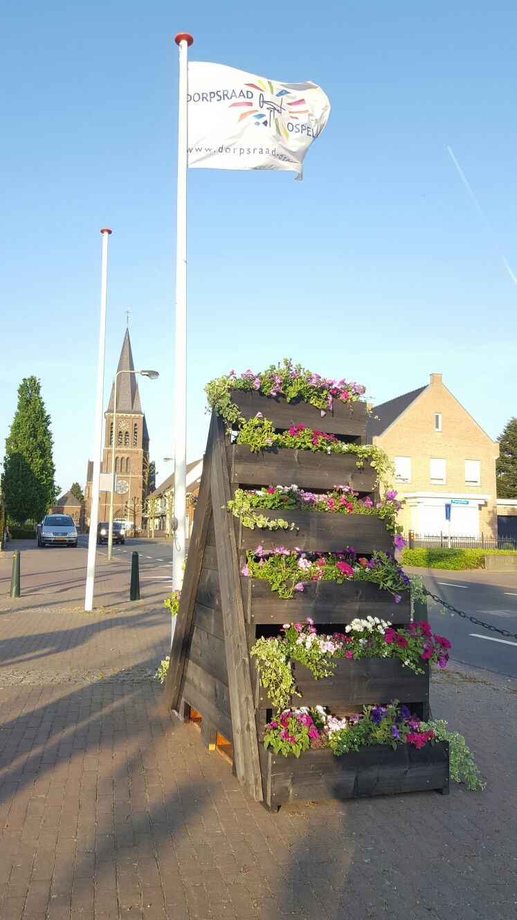 Vrijdagavond was het dan eindelijk zo ver. Op initiatief van de Dorpsraad Ospel is er dan toch een opfleuring van de Ospelse dorpskern in zicht. De eerste plantentoren van 1,90 meter hoog, is geplaatst op het Aerthijsplein. Bij de juiste weersomstandigheden en onderhoud, ontwikkeld deze toren zich tot een ware bloemenpracht.