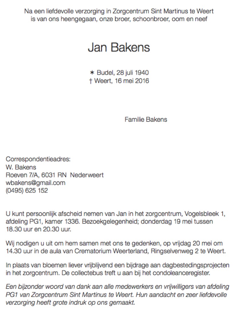 Namens FNV Bouw Nederweert wensen wij de familie Bakens heel veel sterkte met dit verlies.