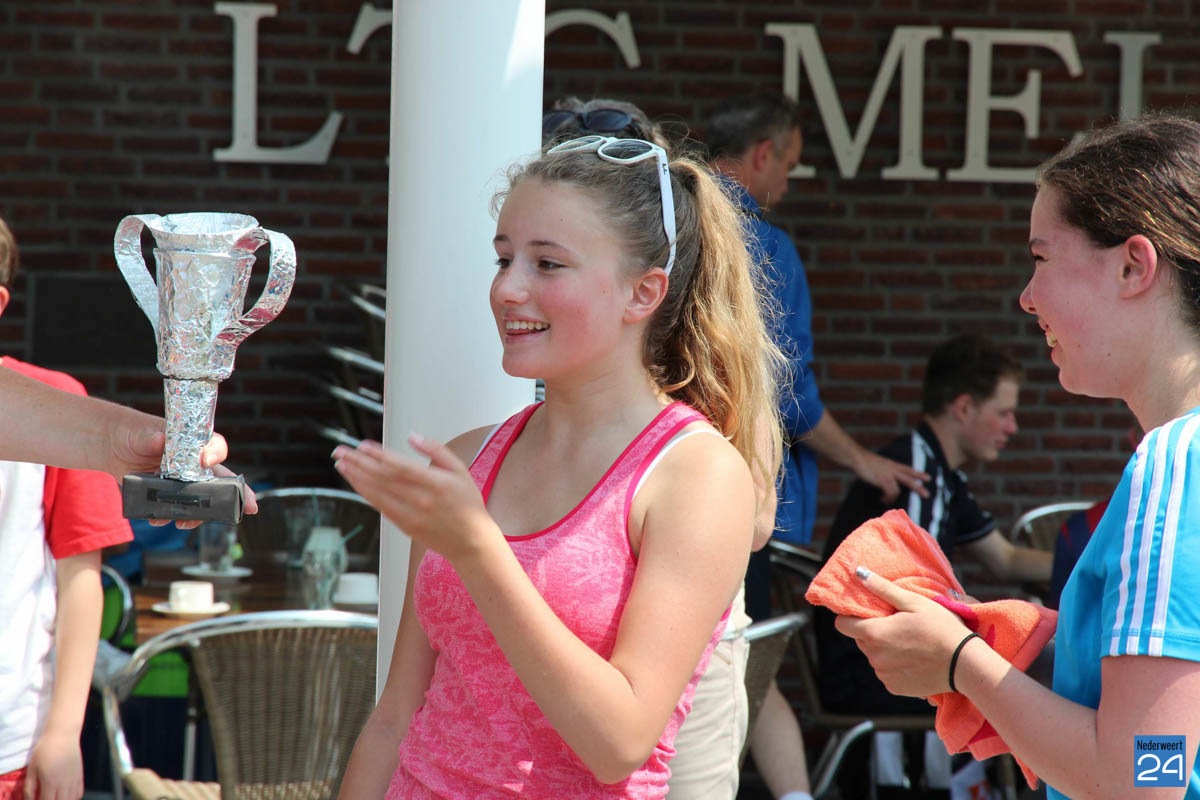 De meiden hadden zelf voor een bijpassende taart gezorgd, Met champagne, medailles, snoepzakken en een heuse kampioensbeker werd Meijel op z’n kop gezet. Daarbij alle lof voor de zeer sportieve tegenstanders die een bloemetje hadden klaar staan voor onze kampioenen.