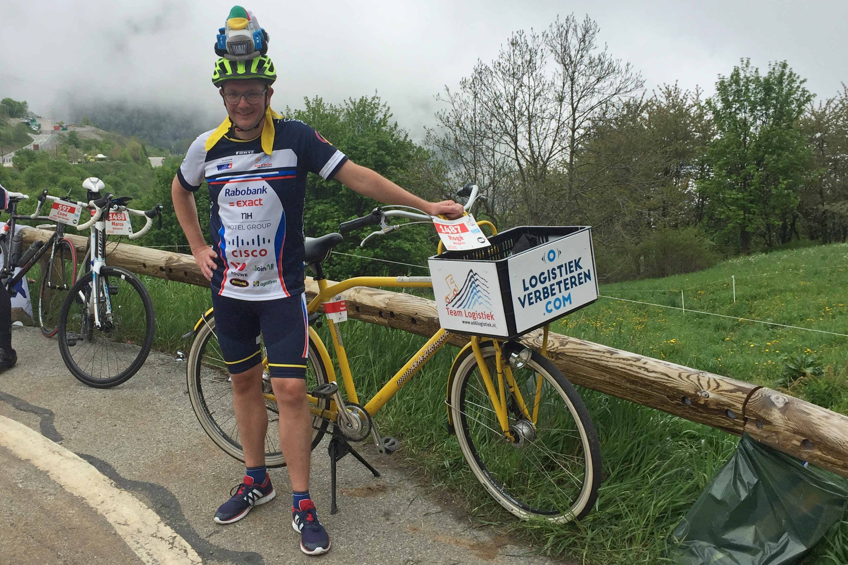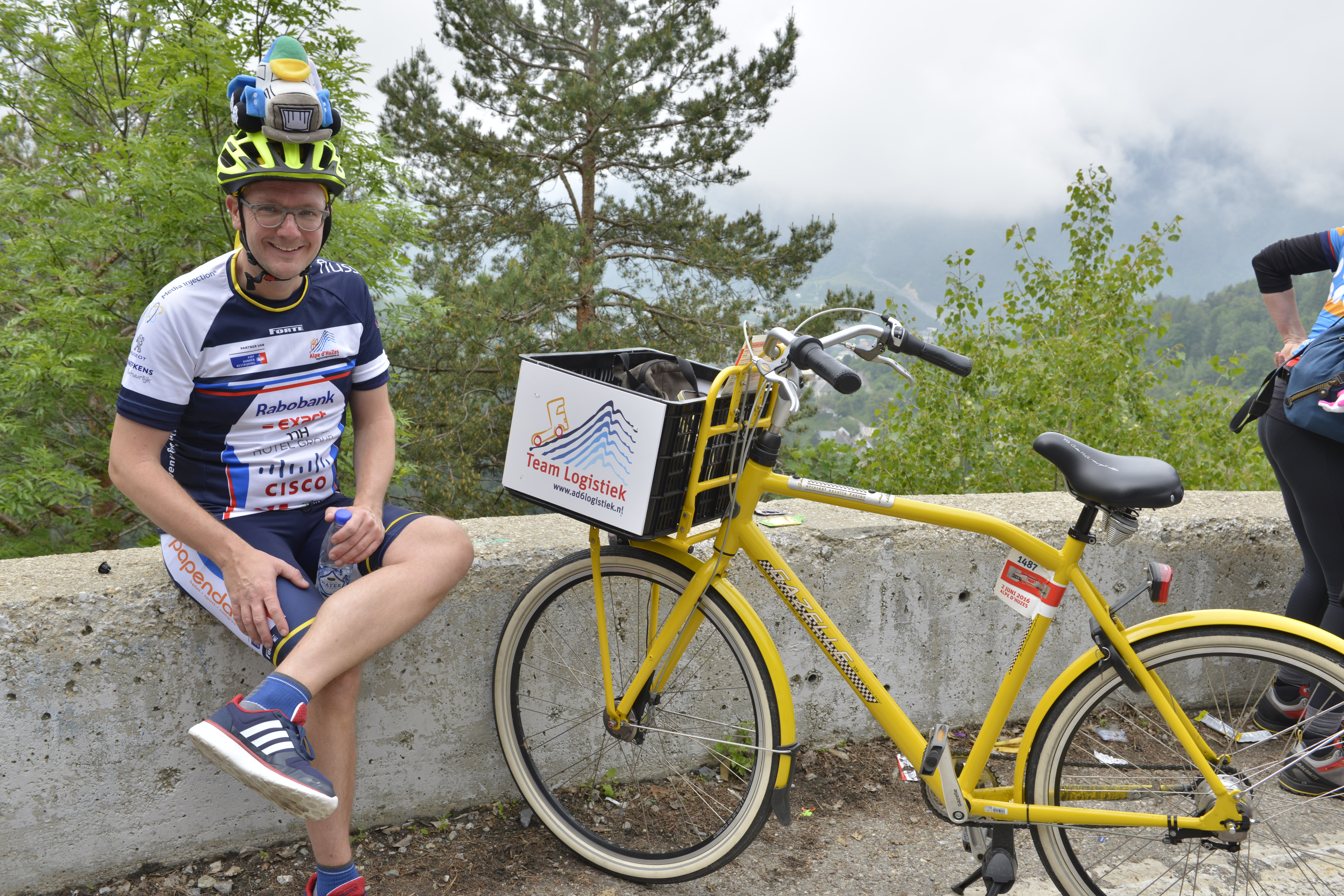 Vandaag gaat het gebeuren: de eerste beklimming van de Alpe d’Huez met mijn gele transportfiets. Na een uurtje zegt een van mijn teamgenoten gekscherend tegen mij: “met jou fietsen is niks aan, alle aandacht gaat naar jou”. Inderdaad: een overvloed aan enthousiaste reacties tijdens de klim. Op het toejuichen van het woord “respect” antwoord ik steevast “wederzijds”.