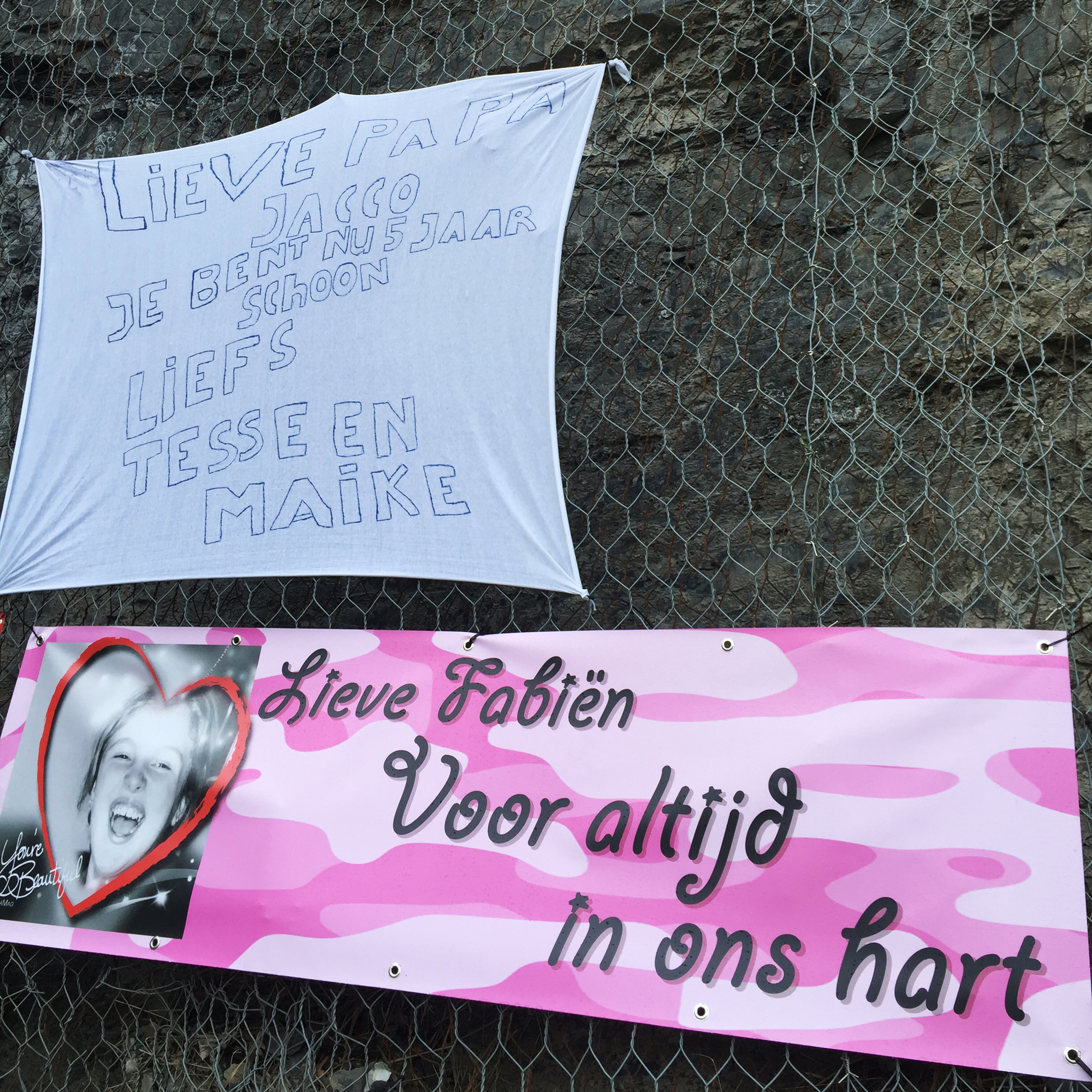 De eerste spandoeken hangen langs de berg. De teksten blijven me aangrijpen, zeker wanneer het gaat om kinderen of jonge ouders die de strijd verloren hebben tegen kanker.