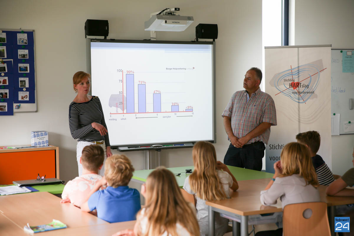 Paulien van Mierlo en Antoine Hekers hebben vandaag voor groep 8 van basisschool De Schrank in Ospel een informatieve les gegeven over Stichting Hartslag voor Nederweert. Paulien en Antoine vertelden een verhaal uit eigen ervaring om de kinderen te informeren en bekend te maken met het belang van de stichting. Paulien heeft in 2012 zelf een hartstilstand gehad en heeft het overleefd dankzijn het gebruik en de inzet van een AED.