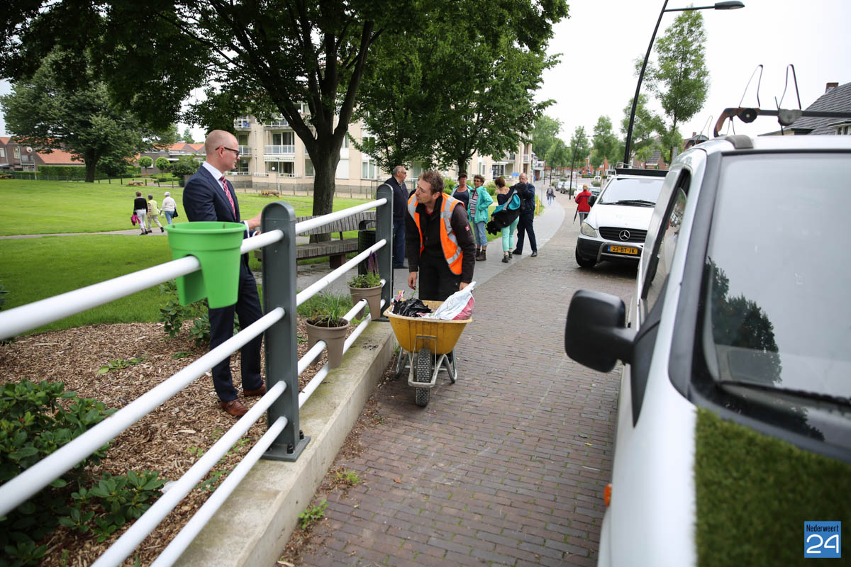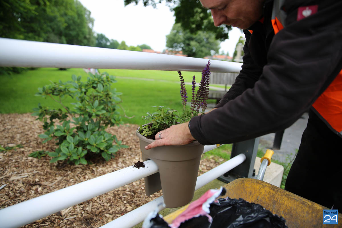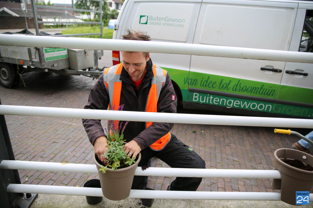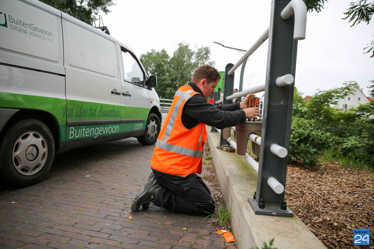 OVNederweert plaatst bloemen Burg 15-6Maandagmorgen zijn, onder toeziend oog van wethouder Mackus, de eerste plantenbakken opgehangen aan Brug 15 in Nederweert. Deze bakken zorgen voor iets meer kleur in de straten van de gemeente. De plantenbakken zijn een initiatief van de Ondernemers Vereniging Nederweert (OVNederweert) om te komen tot een aantrekkelijker centrum met meer kleur.