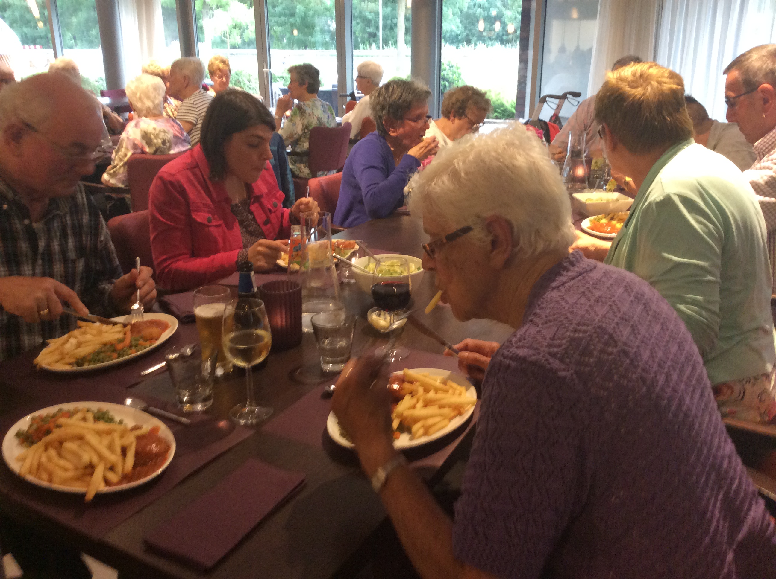 Gisteravond waren de gasten van het Eetpunt te gast bij Gasterij de Ontmoeting in Zorgcentrum St. Joseph. Ze werden hartelijk ontvangen en hebben genoten van een heerlijk 3-gangen diner. Ze werden in een prettige ambiance ontvangen. Vooraf kregen ze een heerlijke aspergesoep, vervolgens een kipschnitsel met zigeunersaus met frietjes, salade en erwtjes met worteltjes, en als toetje ijs met slagroom en warme kersen.