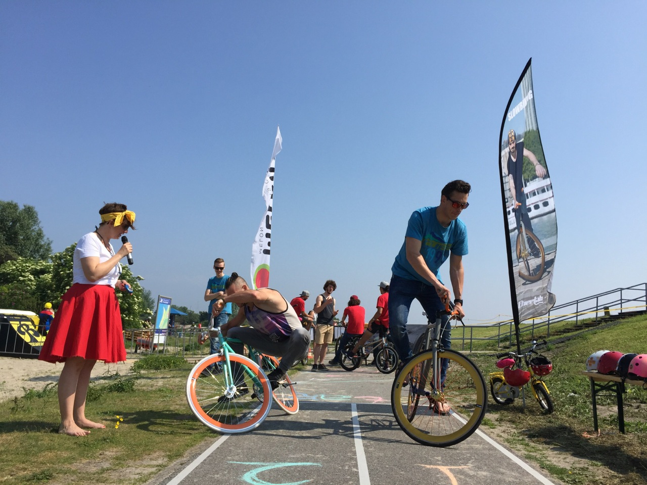Het lijkt makkelijk, heel lang doen over een parcours van elf meter. Maar zonder de lijnen te raken en je voeten aan de grond te zetten, is veel concentratie nodig, balans en fietstechniek. Een enigszins geoefende slowbiker doet een minuut over die elf meter, maar het wereldrecord staat op maar liefst meer dan twee uur. Saai is zo’n contest helemaal niet, het is juist een spektakel. Een enthousiaste speaker zweept de deelnemers op en er zijn muzikanten die de race al improviserend muzikaal begeleiden.