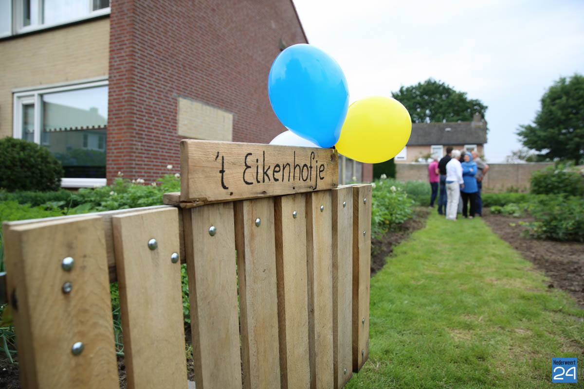 Het hekwerk staat, de grond zit vol met plantjes. Eindelijk kunnen de deelnemers het poortje van ’t Eikenhofje open zetten. De gezamenlijke tuin is 25 meter bij 10 meter groot en wordt onderhouden door acht bewoners uit de Eikenstraat. De verwachting is dat dit er meer worden.