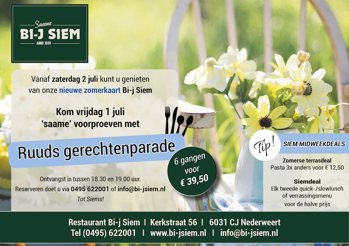 Iedere eerste vrijdag van de maand serveert het team van restaurant Bi-j Siem Ruuds Gerechtenparade. Elke maand wordt er voor een specifiek thema gekozen. De maand juli staat in het teken van de nieuwe zomerkaart. Met de zes gangen gerechtenparade en een amuse vooraf (€ 39,50 per couvert) geven chefkok Ruud en zijn brigade een mooie voorproef voor een zeer gevarieerde zomerkaart.
