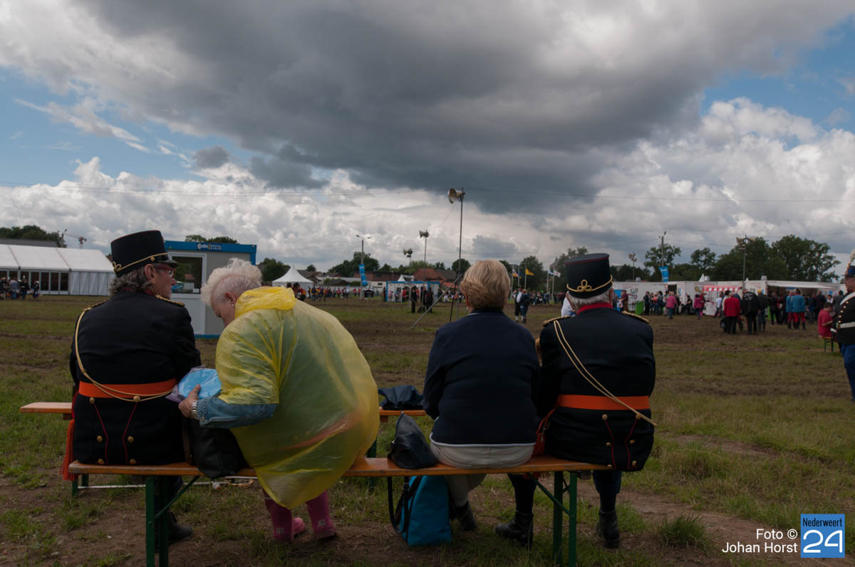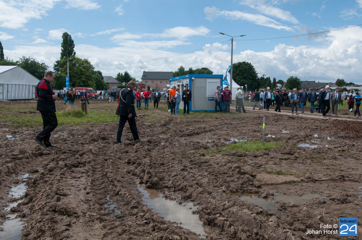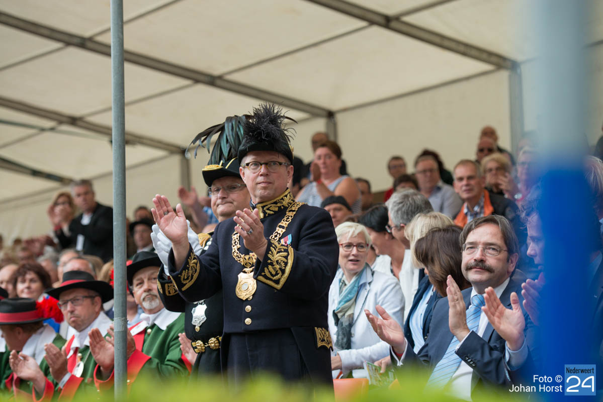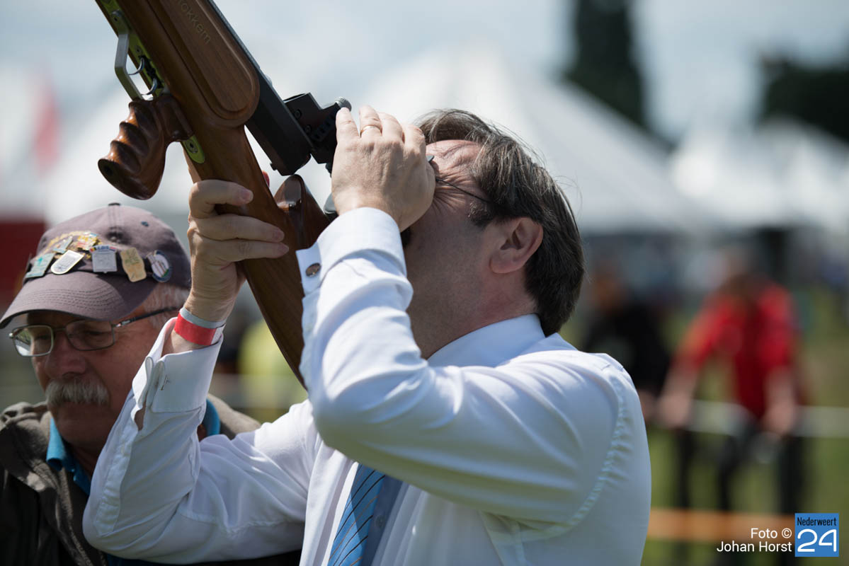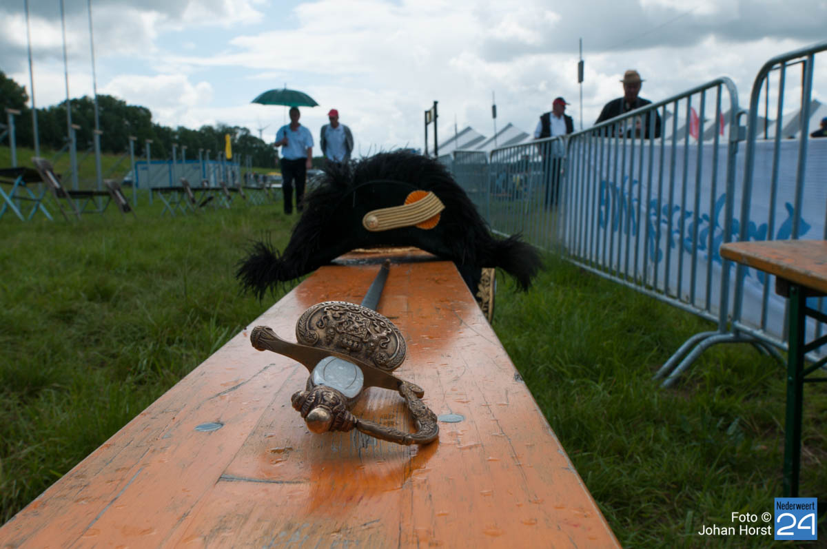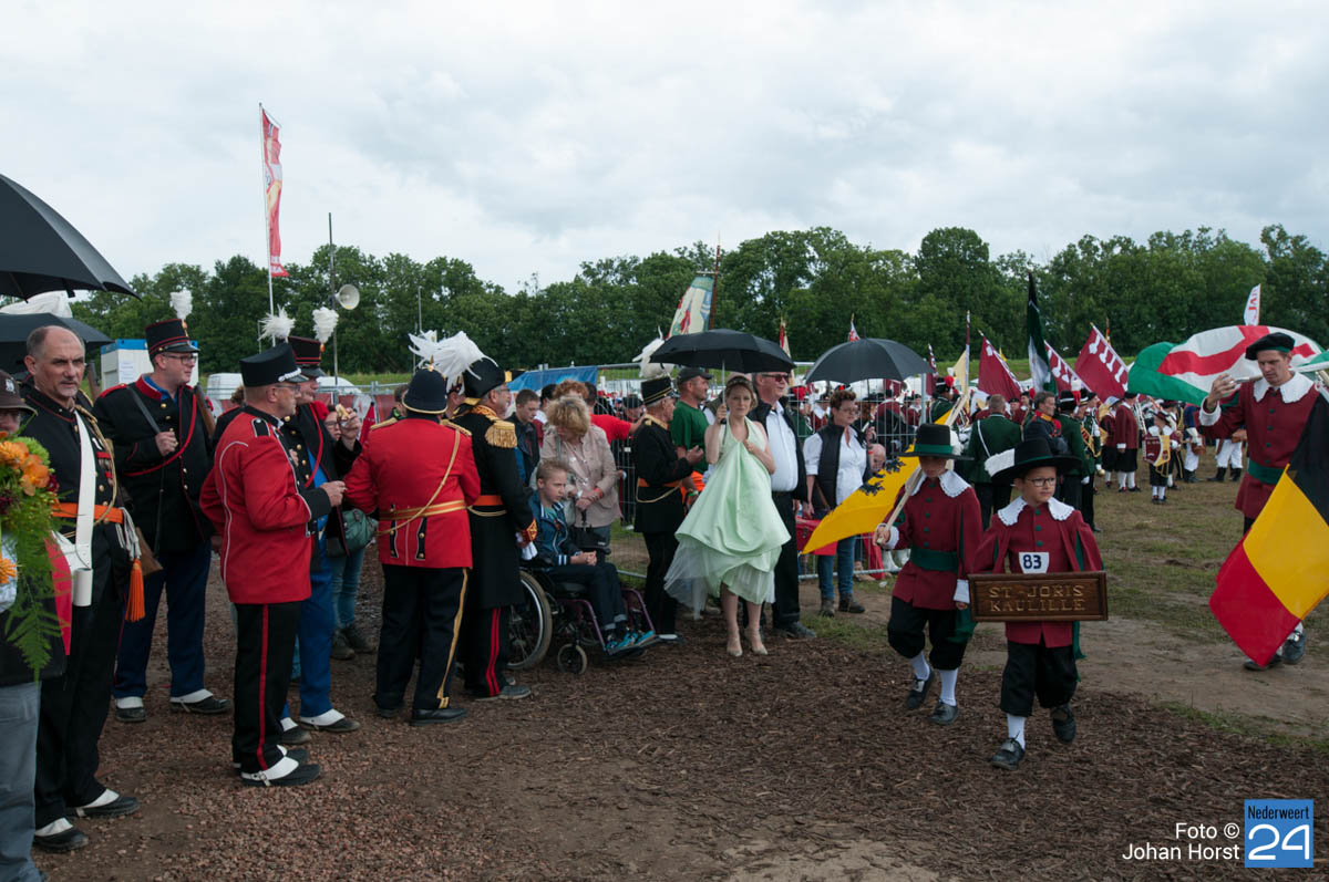 Na de openingsceremonie, die werd bijgewoond door gouverneur Reynders (B) en Bovens (NL), ging de traditionele optocht van start. De jury had vanwege de modder besloten om het onderste deel van de uniformen dit jaar niet mee te nemen in de jurering. Na een lange maar zonnige middag klonk even voor vijf uur het eerste schot op de wei en was het kavelen begonnen. In de eerste ronde vielen heel veel schutterijen af en strijden Volgende week nog 30 schutterijen voor d’n Um.