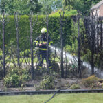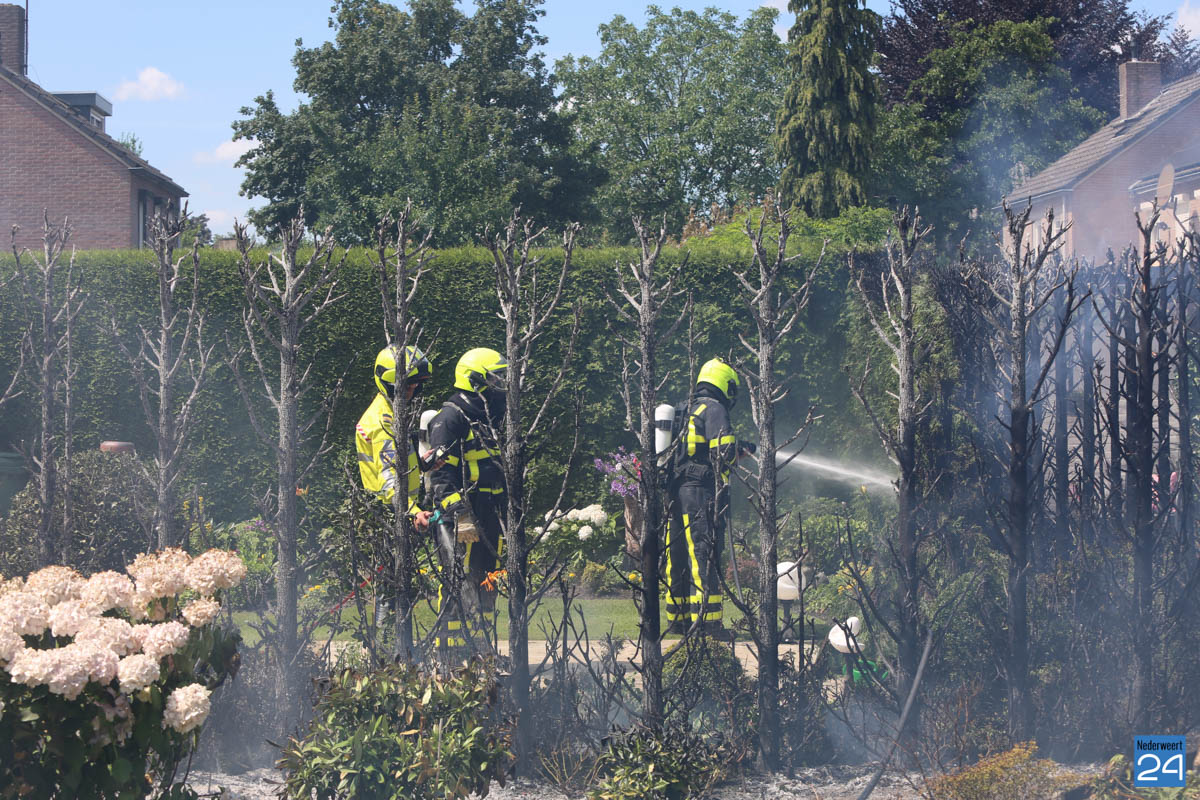 Zondagmiddag is in een tuin van een woning én daarmee de vier aangrenzende tuinen aan de Overweertstraat een coniferenhaag in de fik gevlogen. Binnen een mum van tijd stond de complete haag in de hens. Ook een tuinhuisje is volledig in vlammen opgegaan.