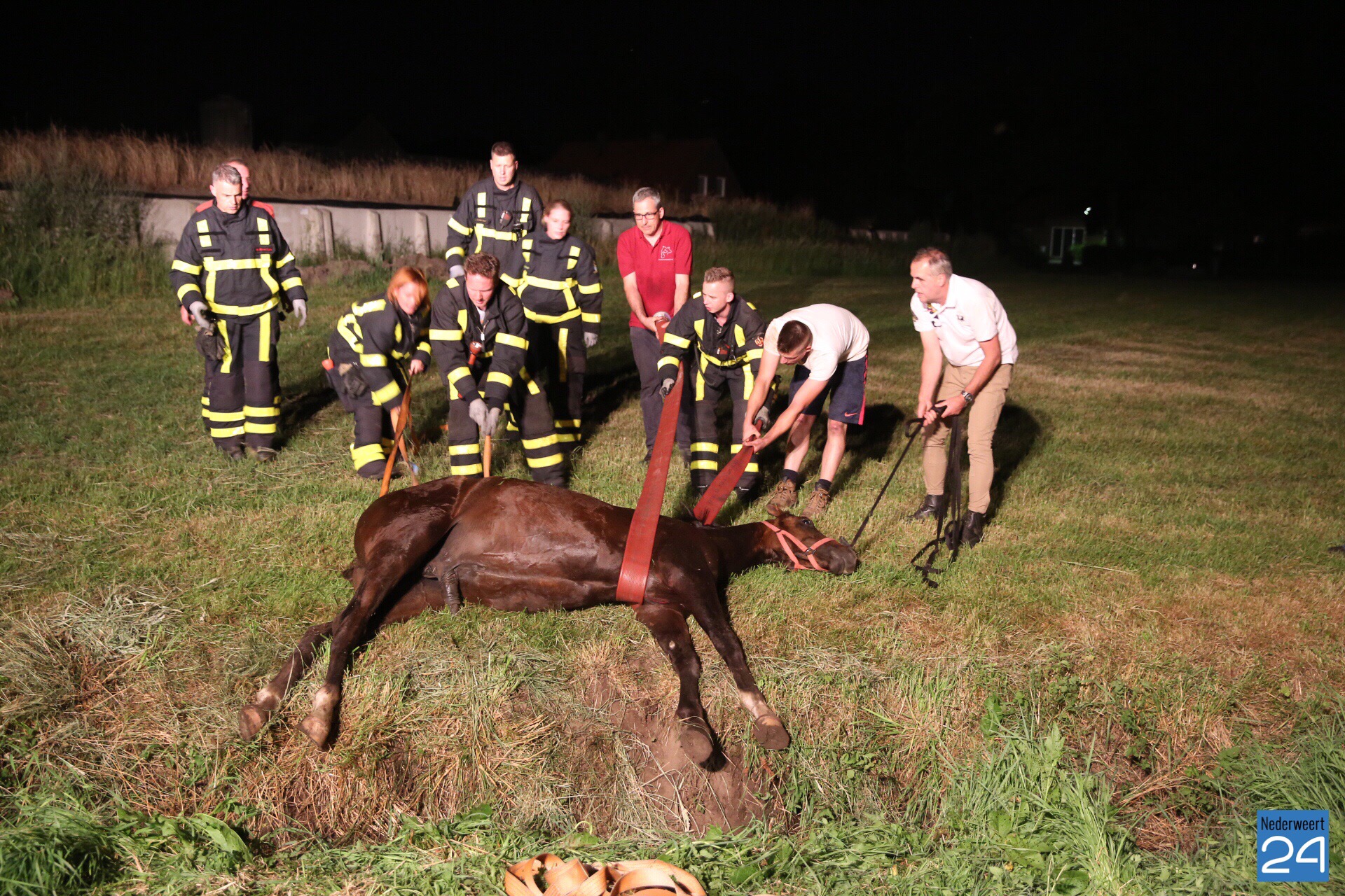 Na verschillende pogingen waren het paard en de hulpverleners te vermoeid. De brandweer en een dierenarts zijn gebeld om het paard met vereende krachten uit haar benarde positie te bevriiden. Met behulp van een tractor uit de buurt is geprobeerd het paard op de benen te tillen, maar dit lukte niet. Toen hebben ze een zeil langs het paard gelegd, het dier omgerold en in een trailer gelegd. De dierenarts gaat bekijken hoe het met het paard gaat.