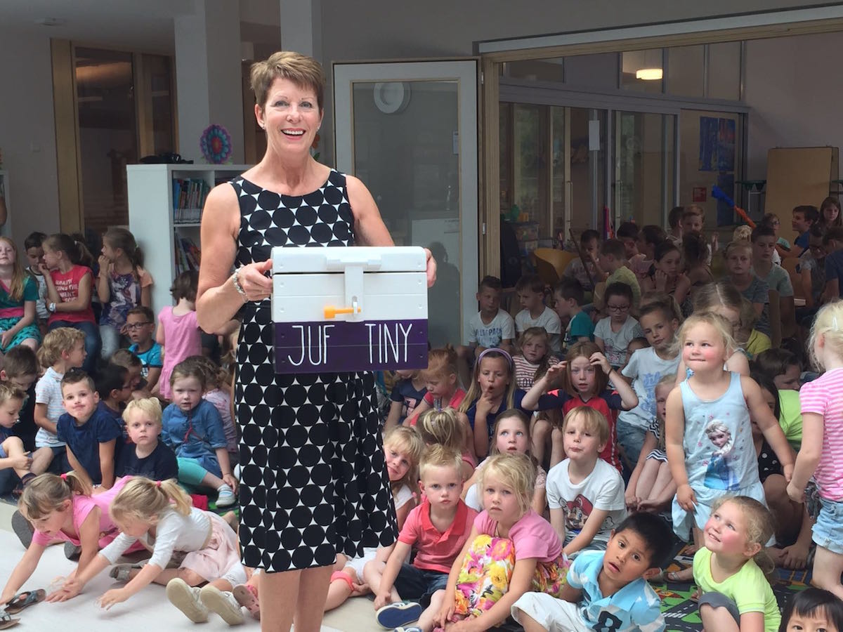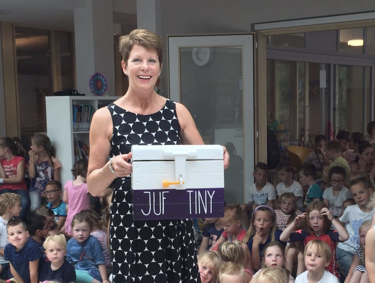 Tijdens een feestelijke dag is zij in het zonnetje gezet. De kinderen hadden samen een feestlied ingestudeerd en met behulp van Judith’s Dance Point leerden alle groepen een eigen dans. Het lied en de dansen werden tijdens de feestelijke middag aan juf Tiny en haar gasten vertoond. Het was een zonnige en gezellige dag, met een hapje, een drankje én een dikke ijs voor iedereen.