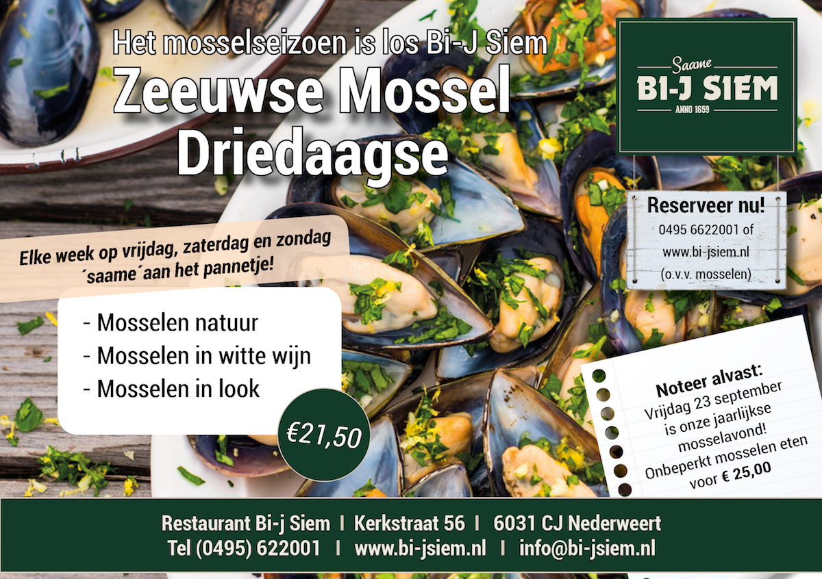 Restaurant Bi-j Siem start komend weekend met de Mosseldriedaagse. Elk weekend kun je op vrijdag, zaterdag of zondag ‘saame’ genieten van heerlijke Zeeuwse mosselen. Het team van Bi-j Siem serveert de pannetjes mosselen in de smaken natuur, witte wijn en look met frietjes of brood en salade voor € 21,50 per pannetje.