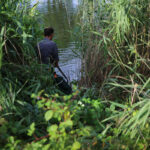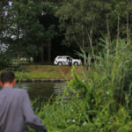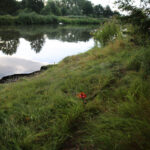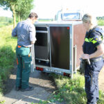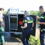 Aan de overkant van het water zijn sporen te zien waar de aanhangwagen waarschijnlijk in het water is gereden. De politie heeft de aanhanger meegenomen voor verder onderzoek.