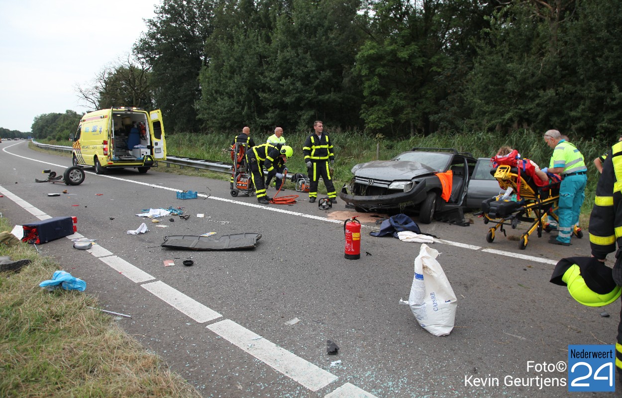 De bestuurder is met onbekend letsel overgebracht naar het ziekenhuis. De brandweer heeft een deur moeten verwijderen om de man uit het voertuig te halen. Zijn auto is zwaar beschadigd geraakt. Onderdelen en persoonlijke spullen lagen verspreidt over de oprit. De brandweer heeft inmiddels alles opgeruimd, en de personenauto is door een berger opgehaald.