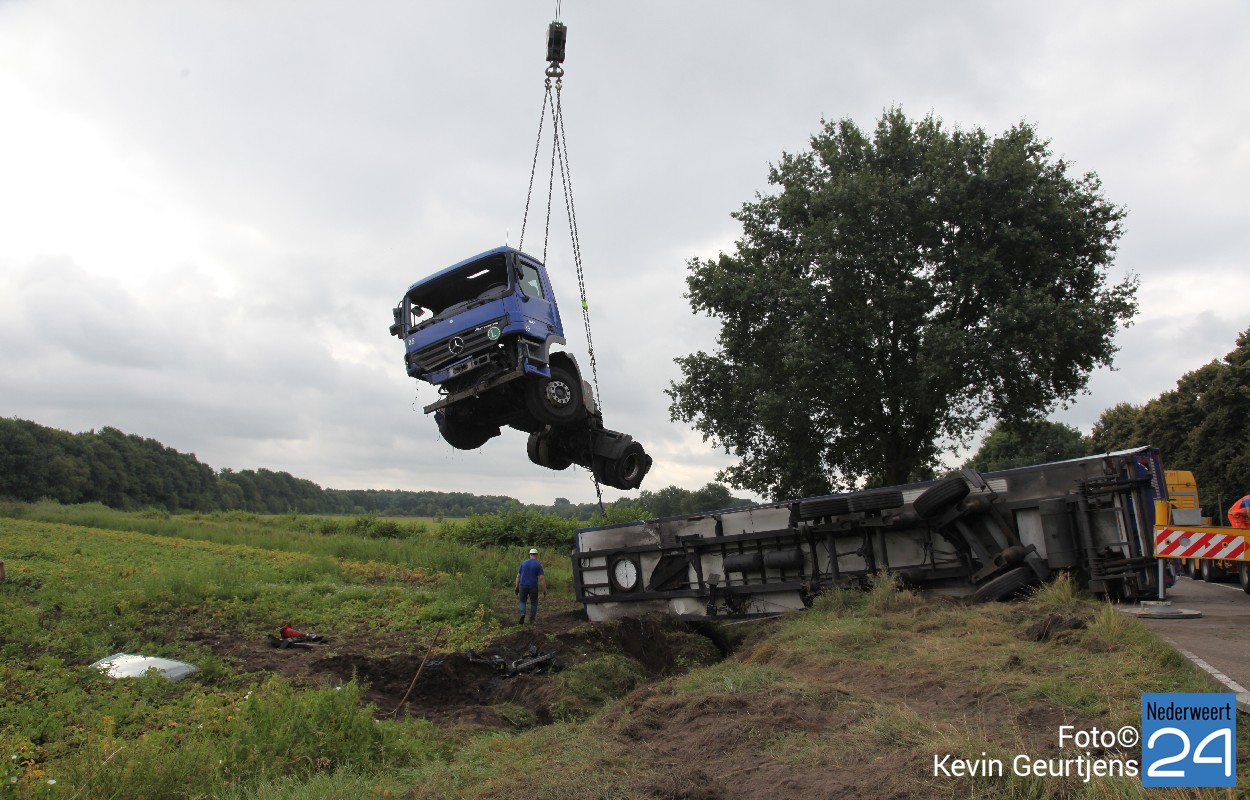 De vrachtwagen die zaterdagochtend op zijn zijkant belandde op de Houtsberg in Nederweert-Eind, is geborgen. Het bergen was een flinke klus. Met hulp van een grote hijskraan werd het gevaarte opgetild. De schade is groot. De Houtsberg was enkele uren afgesloten voor al het verkeer.