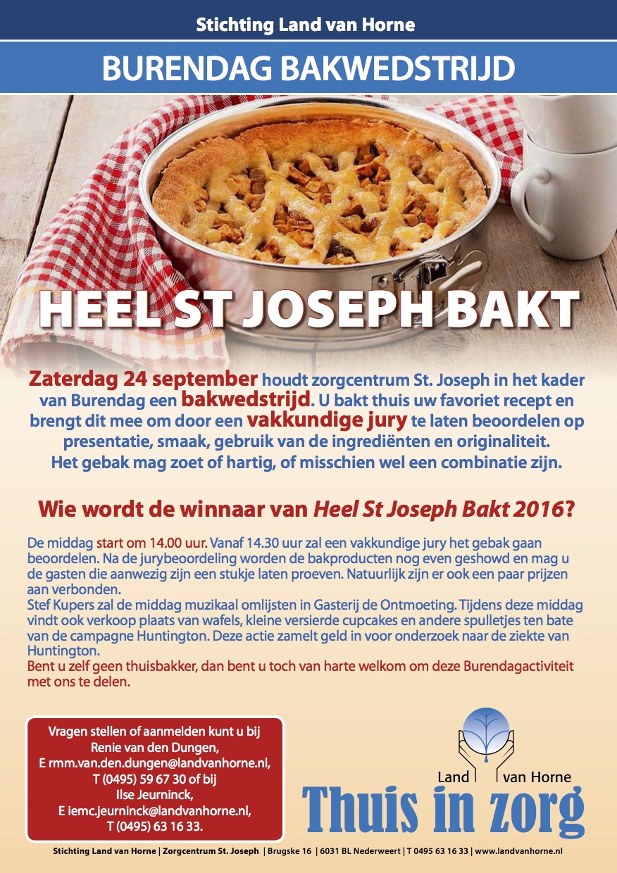Zaterdag 24 september houdt zorgcentrum St. Joseph in het kader van Burendag een bakwedstrijd. Je bakt thuis je favoriet recept en brengt dit mee om door een vakkundige jury te laten beoordelen op presentatie, smaak, gebruik van de ingrediënten en originaliteit. Het gebak mag zoet of hartig, of misschien wel een combinatie zijn.