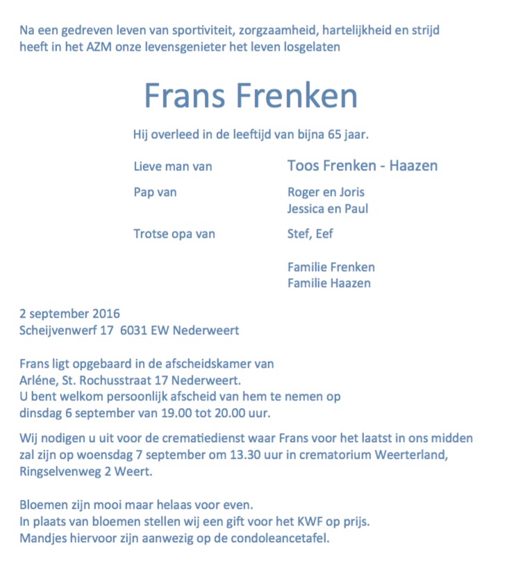 Toos, kinderen, kleinkinderen en familie gecondoleerd en heel veel sterkte toegewenst voor de komende tijd.