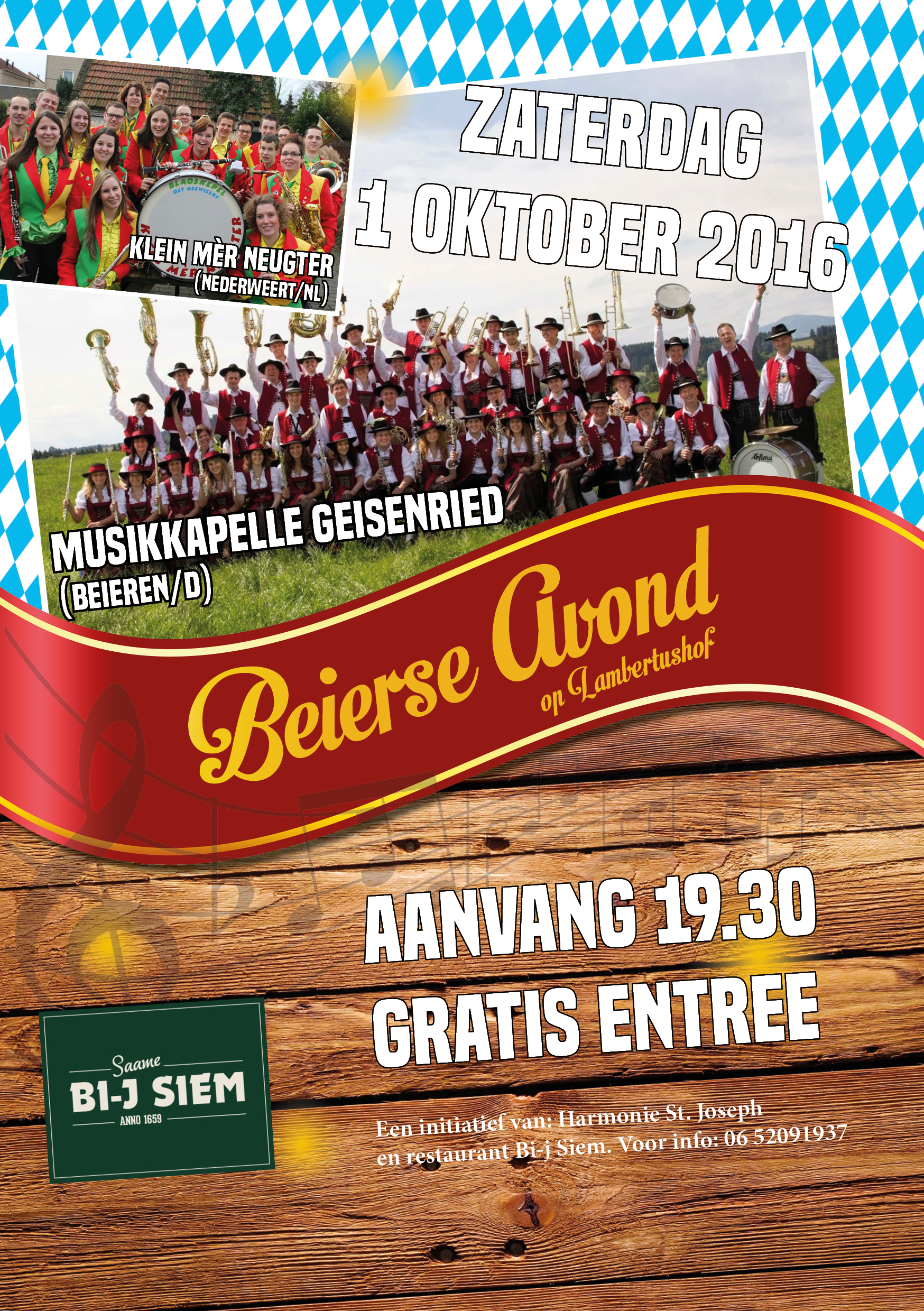 Zaterdag 1 oktober start het Oktoberfest seizoen op Lambertushof in Nederweert. Restaurant Bi-j Siem organiseert i.s.m. Klein Mèr Neugter(Harmonie St Joseph) een unieke Beierse Avond. Hoofdact van de avond is Musikkapelle Geisenried uit het Beierse Geisenried (Ostallgäu-Marktoberdorf). Deze traditionele Beierse kapel telt 76 actieve leden. Klein Mèr Neugter verzorgt de muzikale invulling van het voorprogramma en de pauze.