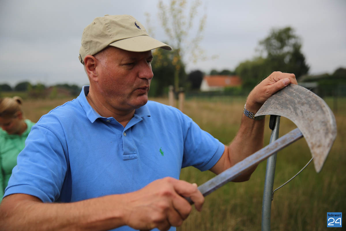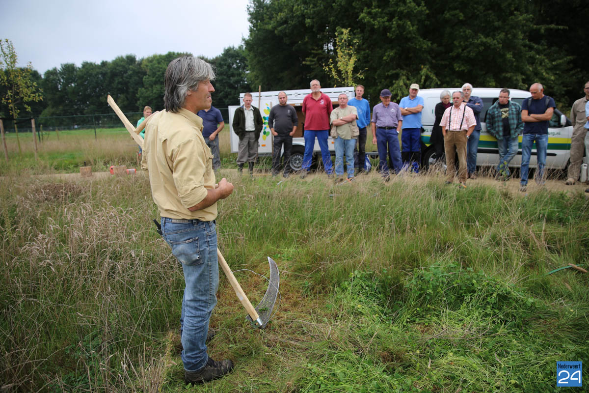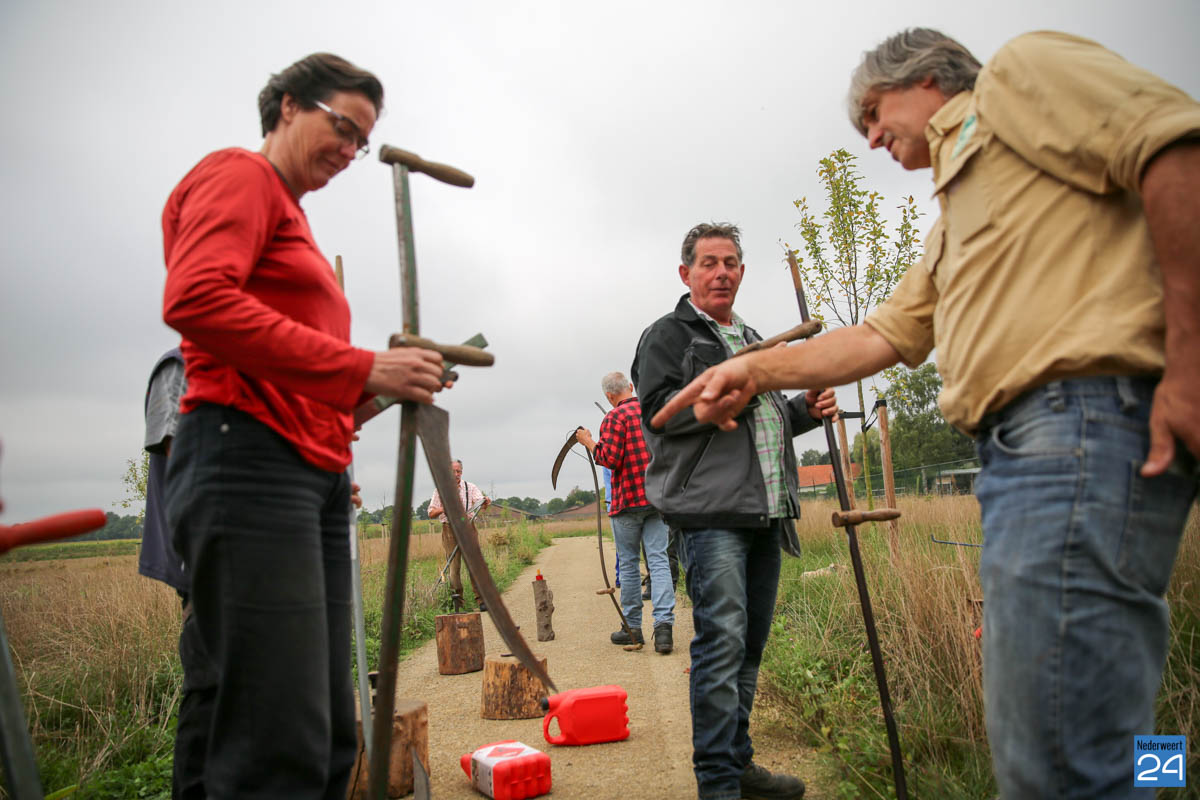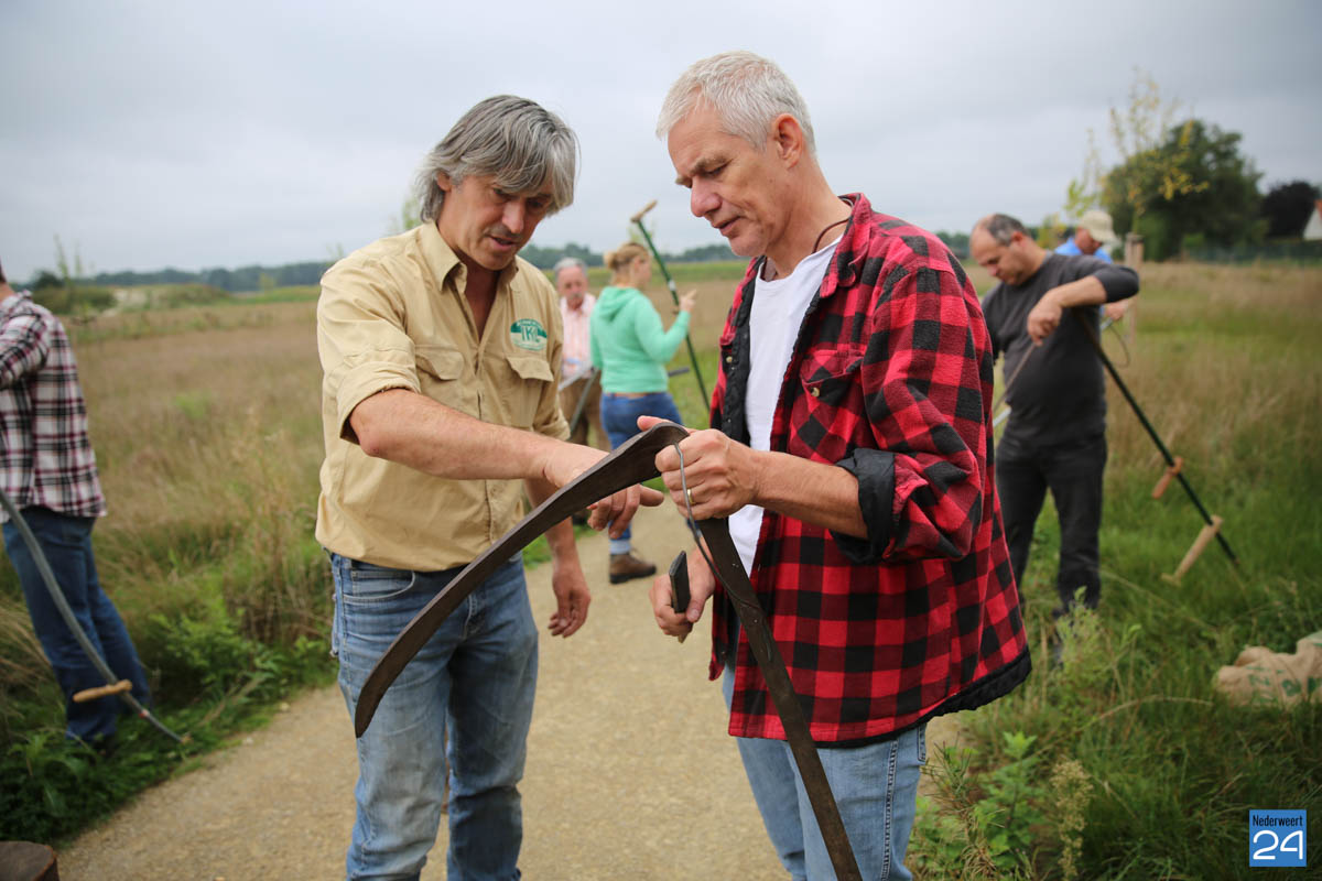 Het mooiste maaiwerk maak je met een scherpe zeis. Vandaar dat tijdens de instructie ook werd ingegaan op de afstelling van de zeis, het wetten (slijpen) en het haren (uitkloppen). Het was een echte praktijkdag. Leren door het zelf te doen.