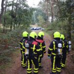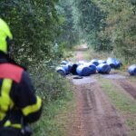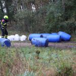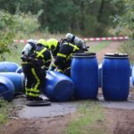 De brandweer heeft de weg afgezet in verband met het onderzoek en het veiligstellen van de vaten. Uit meerdere vaten lekt vloeistof. De gemeente is in kennis gesteld. Brandweer en gemeente is bezig met het opruimen van de vaten en de omgeving.