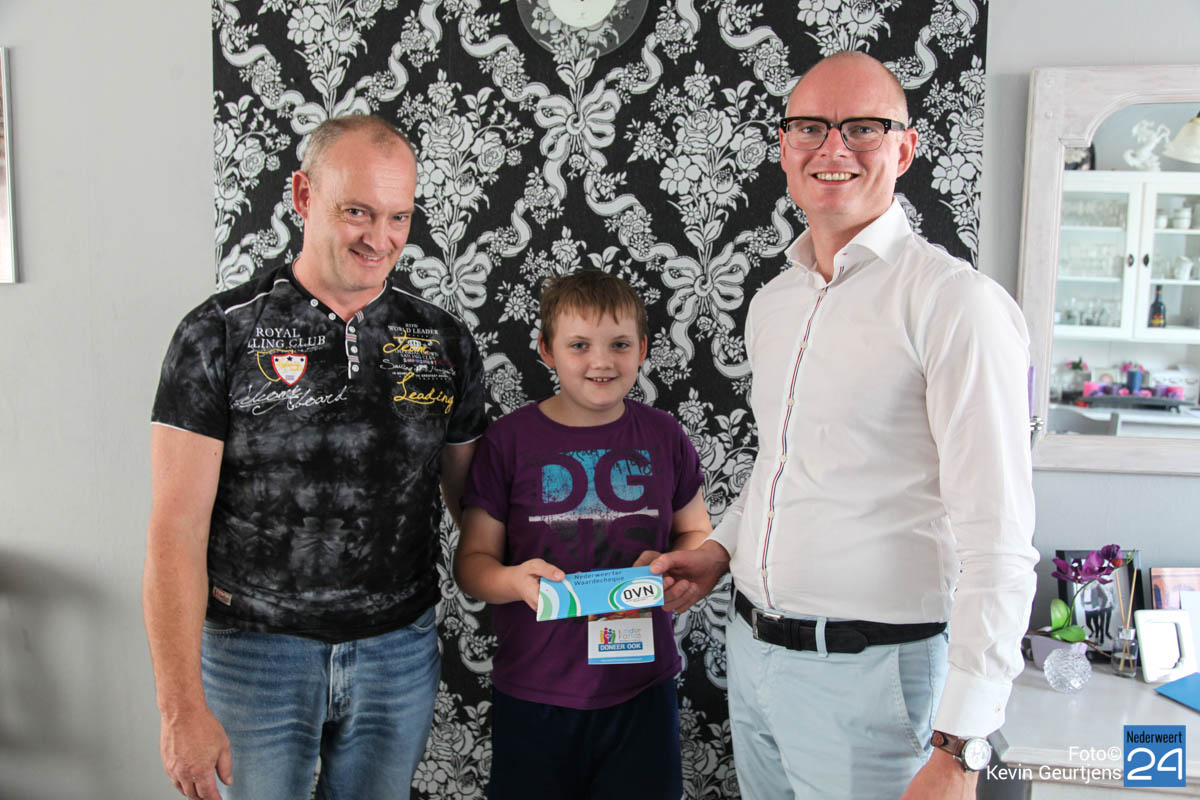Hubert Mackus heeft als voorzitter van het Kinderfonds Midden-Limburg een waardecheque van 125 euro overhandigd aan Paul Reemers uit Ospel. “Ik ben hier super blij mee! Mijn zoon Rick en ik zullen er zuinig op zijn. Het hoeft niet allemaal direct op“, aldus Paul.