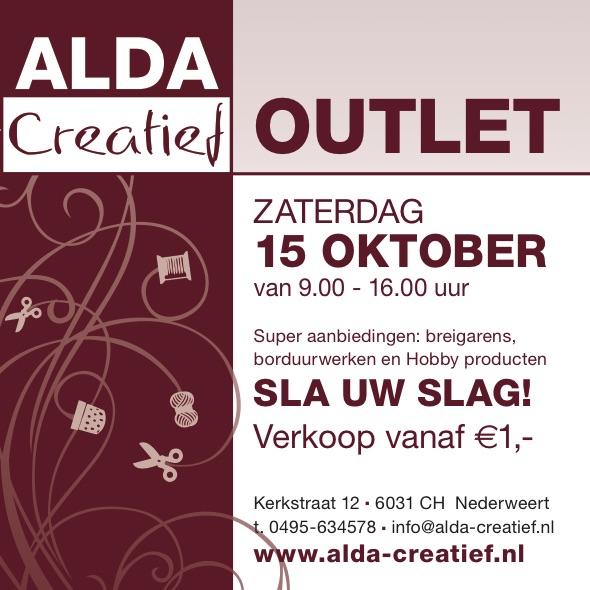 In ditzelfde pand (Kerkstraat 10) wordt zaterdag 15 oktober weer een OUTLET gehouden. Niet alleen garens, maar ook handwerkpakketten, hobby-artikelen en stoffen gaan voor prikkie weg. De outlet begint om 9.00 uur en gaat door tot 16.00 uur. Dus ga een kijkje nemen en sla je slag!