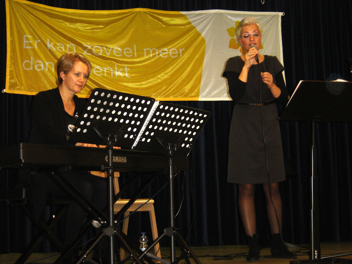 Na vijf en veertig minuten van verrukkelijke muziek was het tijd voor de pauze die ingevuld met voor alle aanwezigen een kopje koffie/ thee met de bekende Limburgse vlaai. Alom werd er weer gezellig gekeuveld. Na de pauze was het de beurt aan twee dames zijnde Willeke Simons & Jolanda Wolters met zang en piano. Willeke Simons verzorgde de zang met veelal Limburgse liedjes van o.a. Wim Sonneveld en Toon Hermans maar ook het lied Hallelujah van Leonard Cohen. Ook nu was de gehele zaal in vervoering. Er werd flink mee gezongen en gedeind op de muziek.