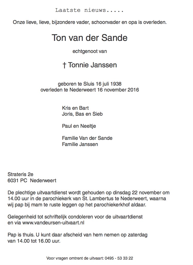 Gecondoleerd met het verlies van jullie vader, schoonvader en opa.